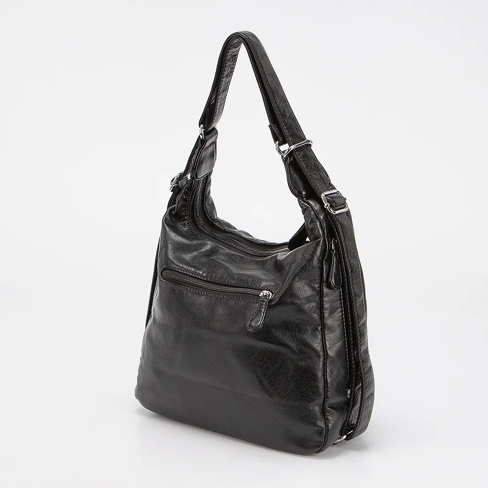 Сумка-рюкзак от торговой марки Passo Avanti выполнен из искусственной кожи черного цвета. Модель с удлиненной ручкой, которая стягивается в плечевые лямки. Два отделения на молнии. Внутри: текстильная подкладка. С лицевой стороны два кармана на молнии.