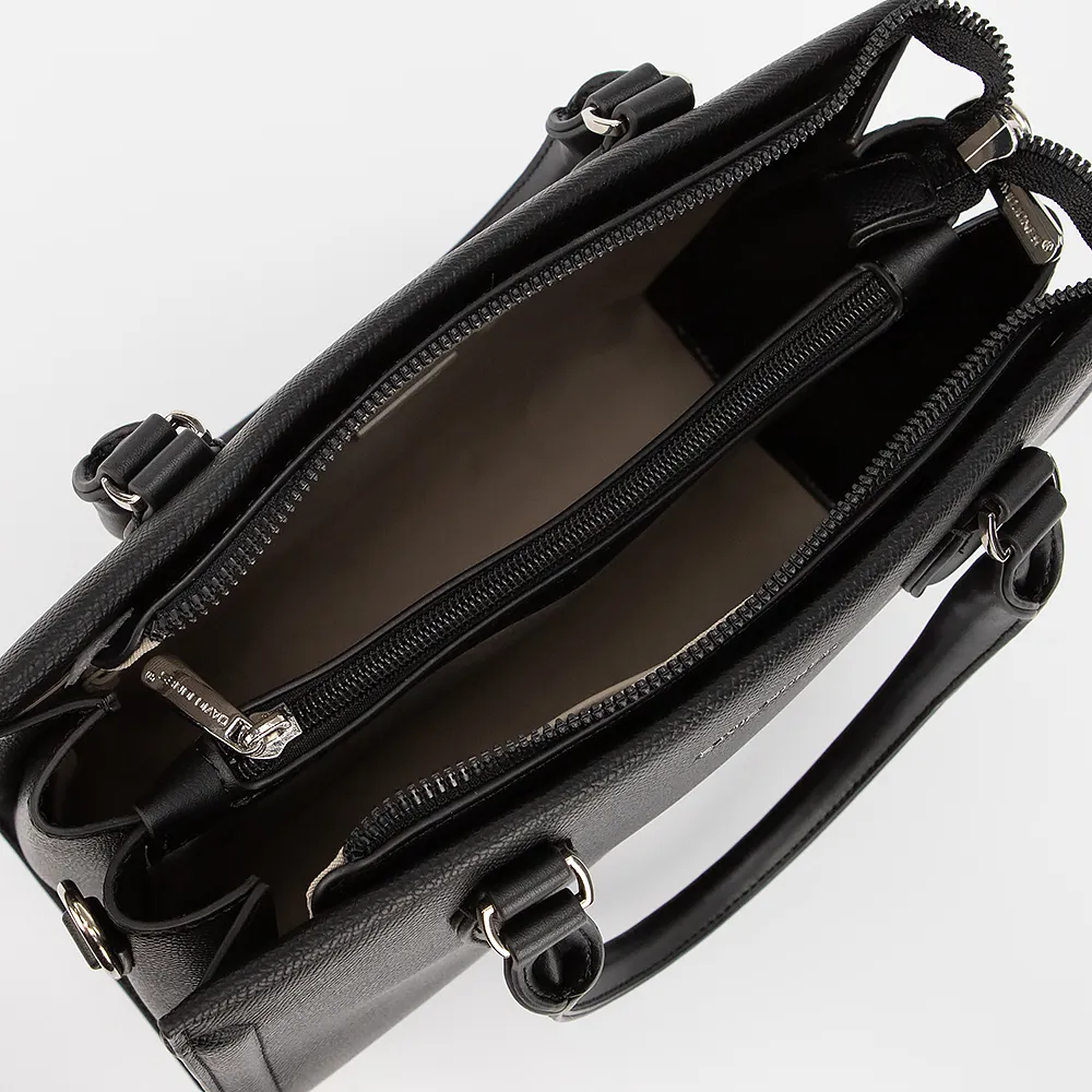 Сумка от торговой марки David Jones выполнена из искусственной кожи черного цвета. Модель с двумя удлиненными ручками и длинным регулируемым плечевым ремнем. Отделение на молнии. Внутри: частичная текстильная подкладка, карман и средник на молнии, накладной карман. Дно оснащено металлическими ножками для защиты от износа.