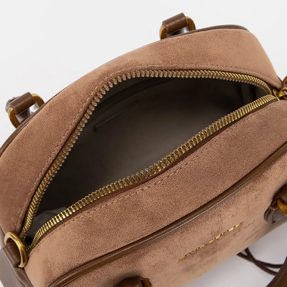 Сумка от торговой марки David Jones выполнена из искусственной замши с элементами искусственной кожи коричневого цвета. Модель с двумя ручками и съемным регулируемым плечевым ремнем. Декорирована подвеской. Отделение на молнии. Внутри: текстильная подкладка, карман на молнии, накладной карман.