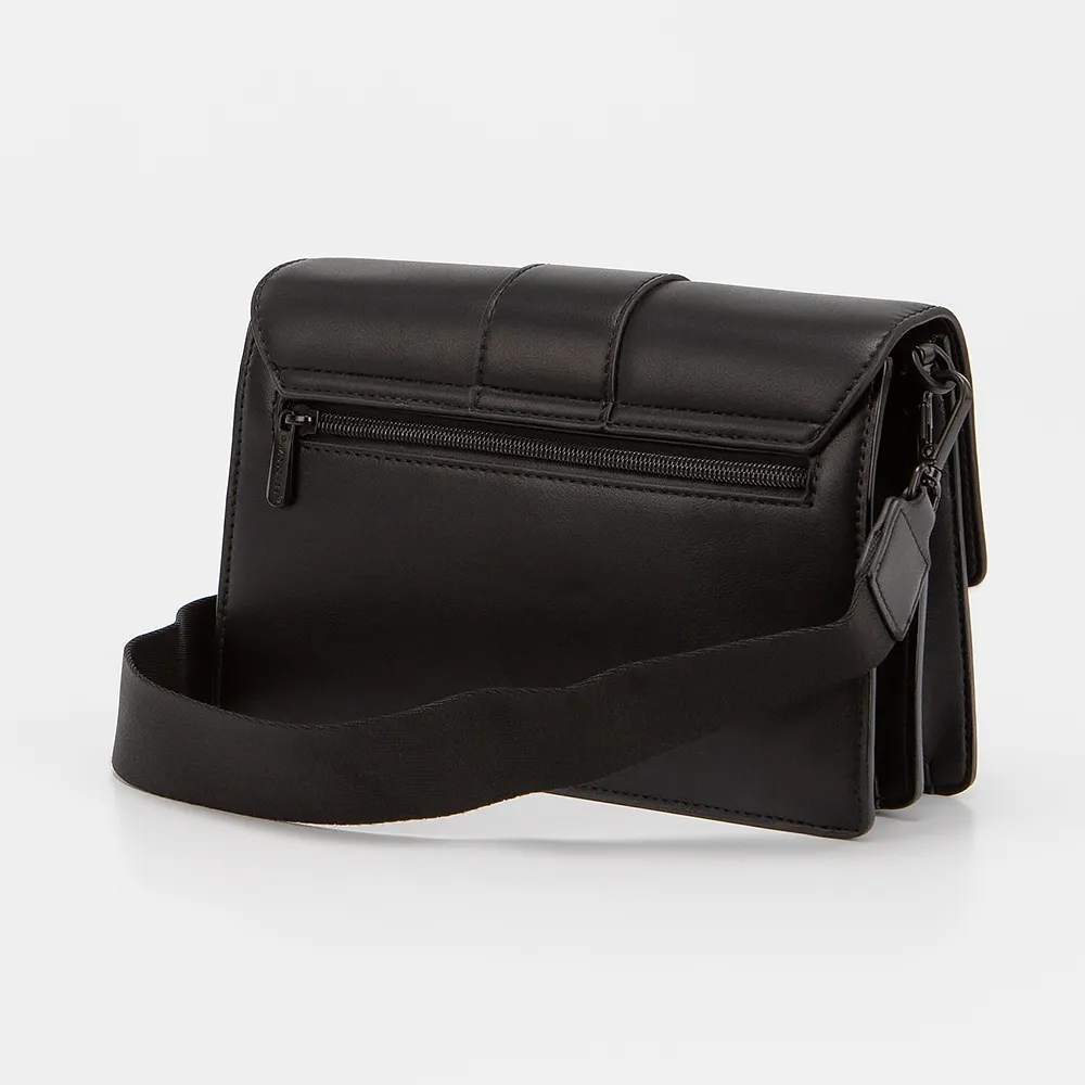 Сумка от торговой марки David Jones выполнена из искусственной кожи черного цвета. Модель со съемным регулируемым плечевым ремнем. Клапан на замке-защелке закрывает отделение с частичной подкладкой. Внутри: карман на молнии, плотный средник. На задней стороне - карман на молнии.