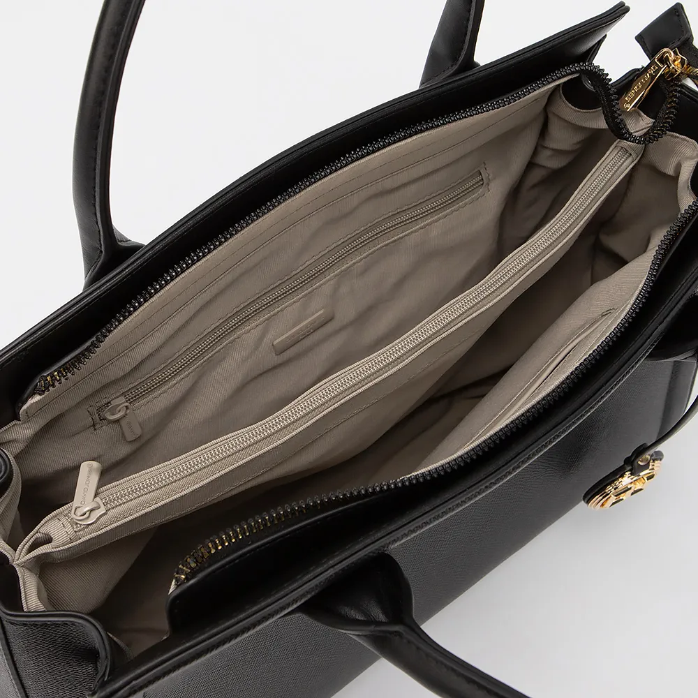 Сумка от торговой марки David Jones выполнена из искусственной кожи черного цвета. Модель с двумя ручками и съемным регулируемым плечевым ремнем. Декорирована подвеской. Отделение на молнии. Внутри: текстильная подкладка, карман и средник на молнии. На задней стороне - карман на молнии. Дно оснащено металлическими ножками для защиты от износа.