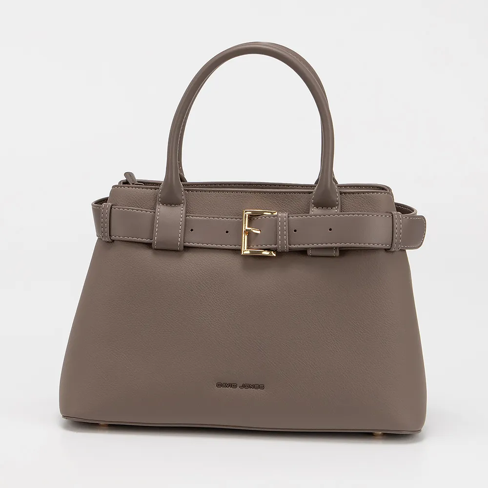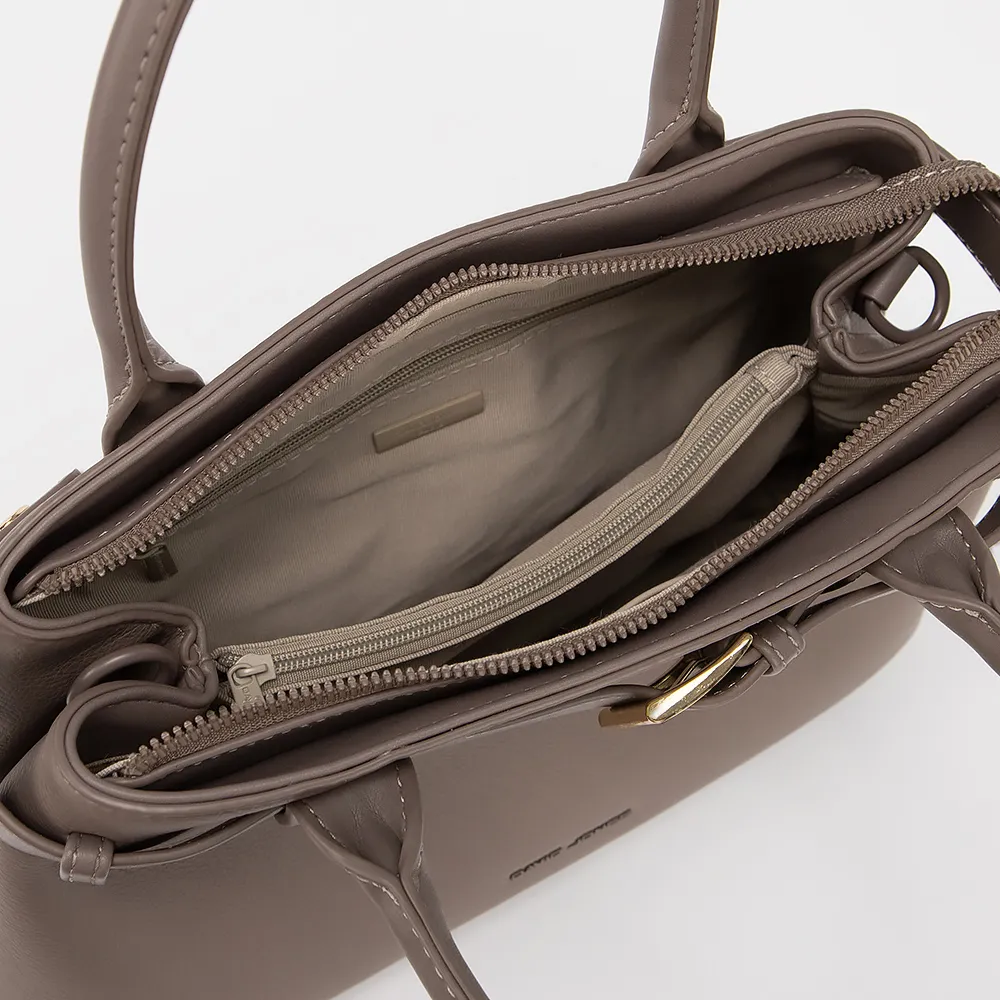 Сумка от торговой марки David Jones выполнена из искусственной кожи кофейного цвета. Модель с двумя ручками и съемным регулируемым плечевым ремнем. Декорирована ремешком с пряжкой. Отделение на молнии. Внутри: текстильная подкладка, карман и средник на молнии, накладной карман. На задней стороне - карман на молнии. Дно оснащено металлическими ножками для защиты от износа.