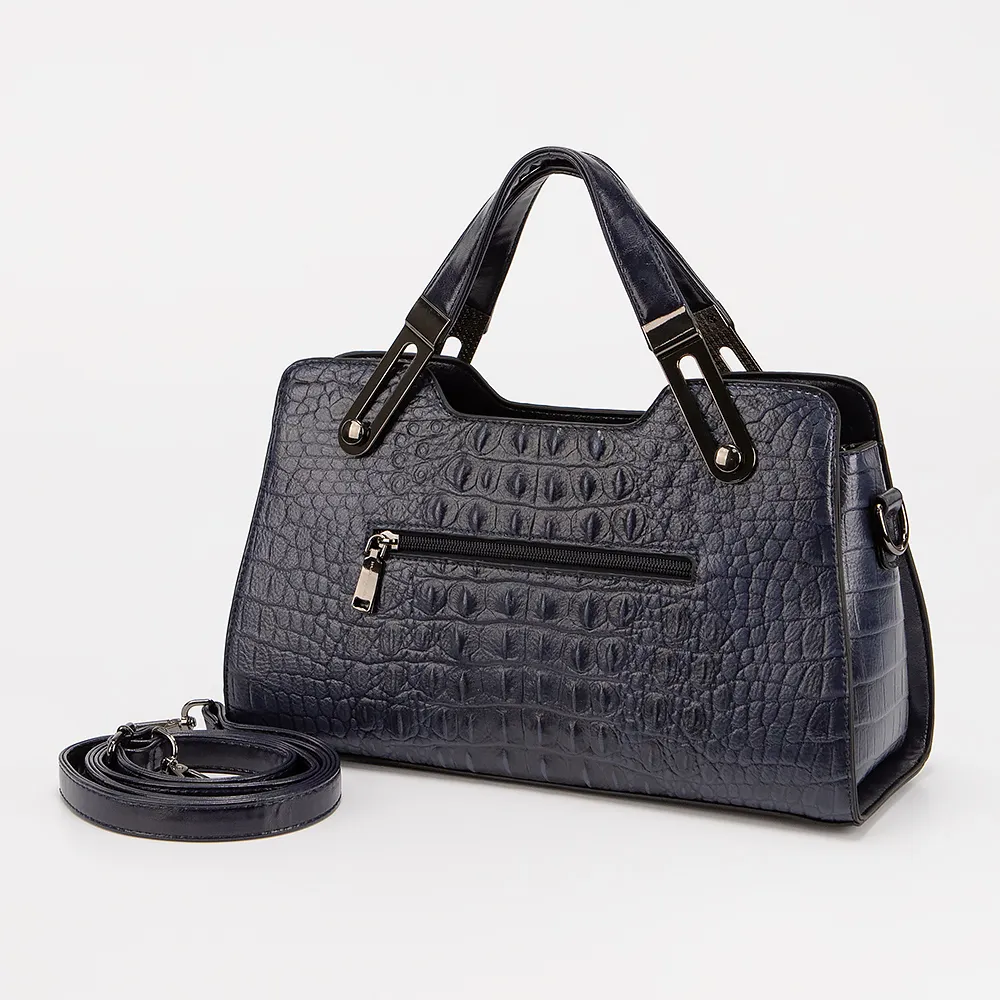 Сумка от торговой марки Marzia выполнена из искусственной кожи синего цвета с тиснением под рептилию. Модель с двумя ручками и съемным регулируемым плечевым ремнем. Отделение на молнии. Внутри: текстильная подкладка, карман и средник на молнии, накладной карман. На задней стороне - карман на молнии.