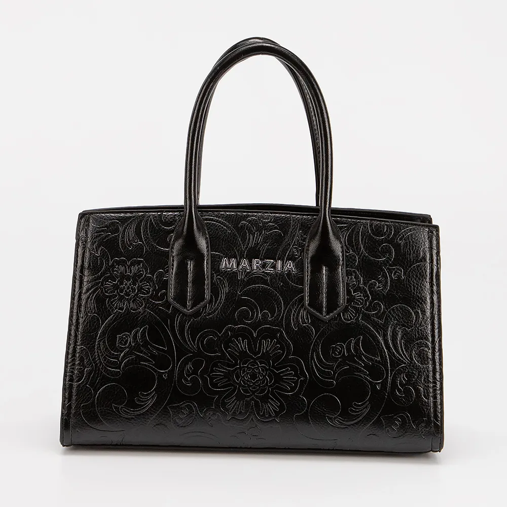 Сумка от торговой марки Marzia выполнена из искусственной кожи черного цвета с цветочным тиснением. Модель с двумя ручками и съемным регулируемым плечевым ремнем. Отделение на молнии. Внутри: текстильная подкладка, карман и средник на молнии, накладной карман. На задней стороне - карман на молнии.