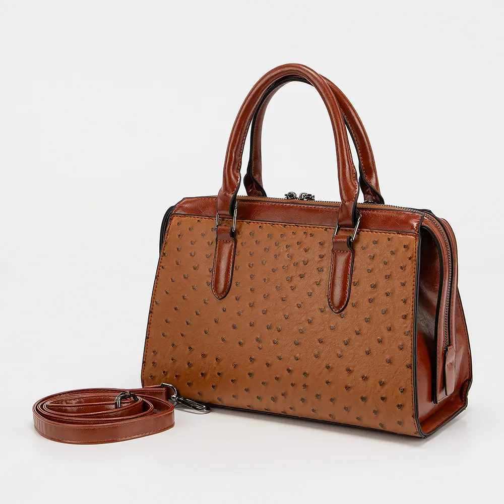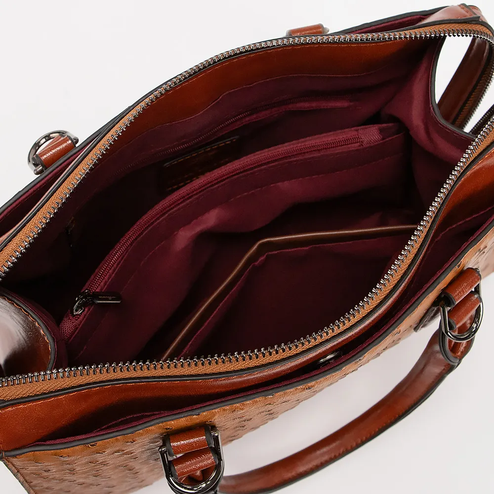 Сумка от торговой марки Marzia выполнена из искусственной кожи коричневого цвета с тиснением под страуса. Модель с двумя ручками и съемным регулируемым плечевым ремнем. Отделение на молнии. Внутри: текстильная подкладка, карман и средник на молнии, накладной карман.
