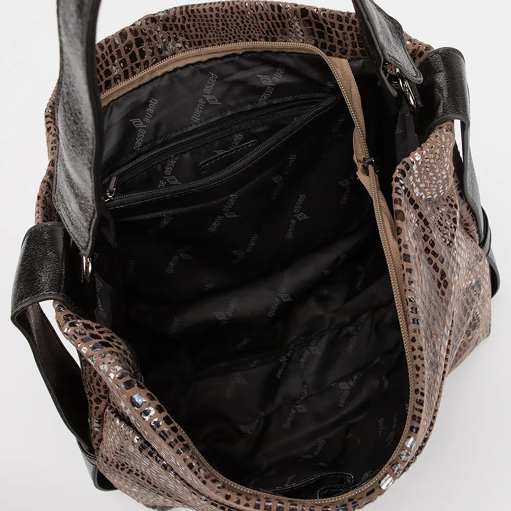 Сумка от торговой марки Passo Avanti выполнена из искусственной кожи кофейного цвета с лазерным тиснением. Модель с удлиненной ручкой. Отделение на молнии. Внутри: фирменная текстильная подкладка, карман на молнии, накладной карман. На лицевой стороне - накладной карман. На задней стороне - карман на молнии.