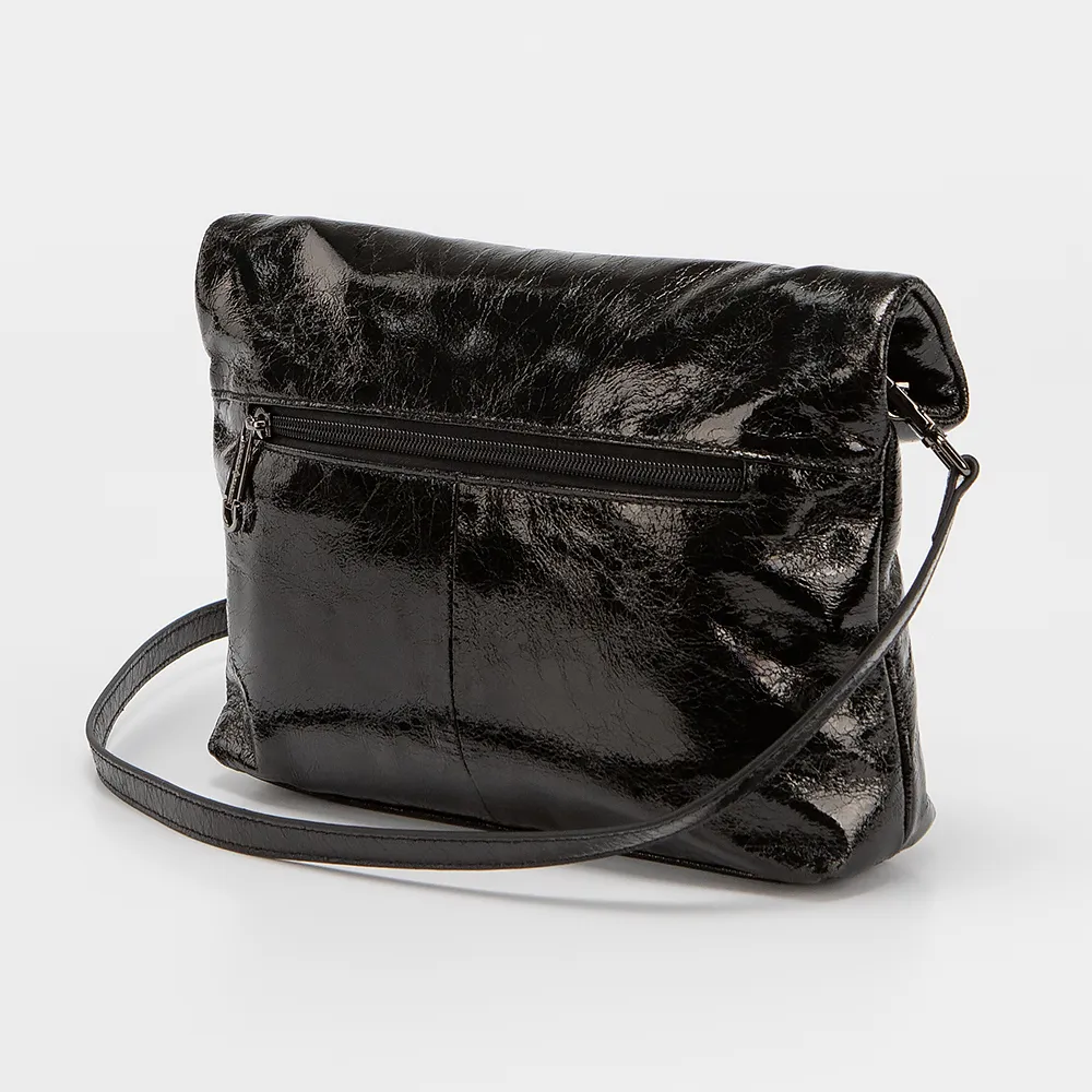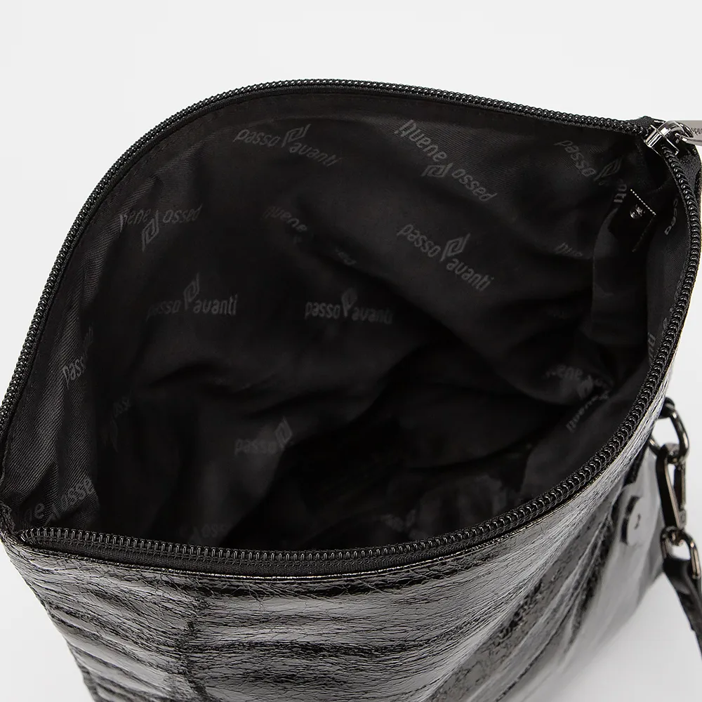 Сумка от торговой марки Passo Avanti из искусственной лакированной кожи с эффектом помятости черного цвета. Модель со съемным плечевым ремнем. Отделение на молнии, дополнительно фиксируется клапаном на магнитных кнопках. Внутри: текстильная подкладка, карман на молнии, накладной карман. На задней стороне - карман на молнии.