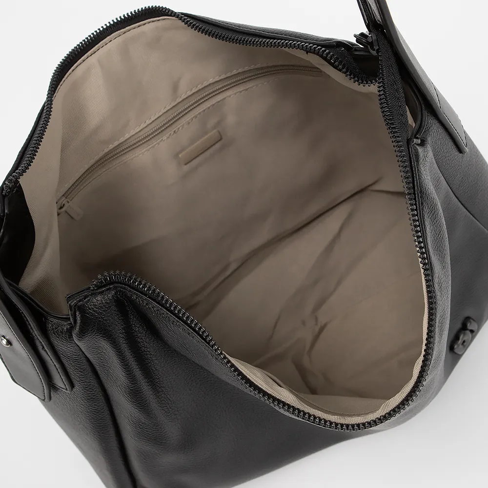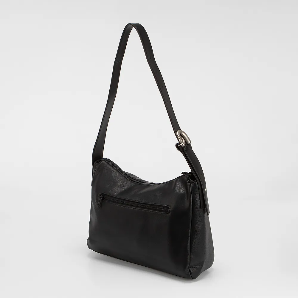 Сумка от торговой марки David Jones выполнена из искусственной кожи черного цвета. Модель с длинной регулируемой ручкой. Отделение на молнии. Внутри: текстильная подкладка, карман на молнии, накладной карман. На задней стороне - карман на молнии.