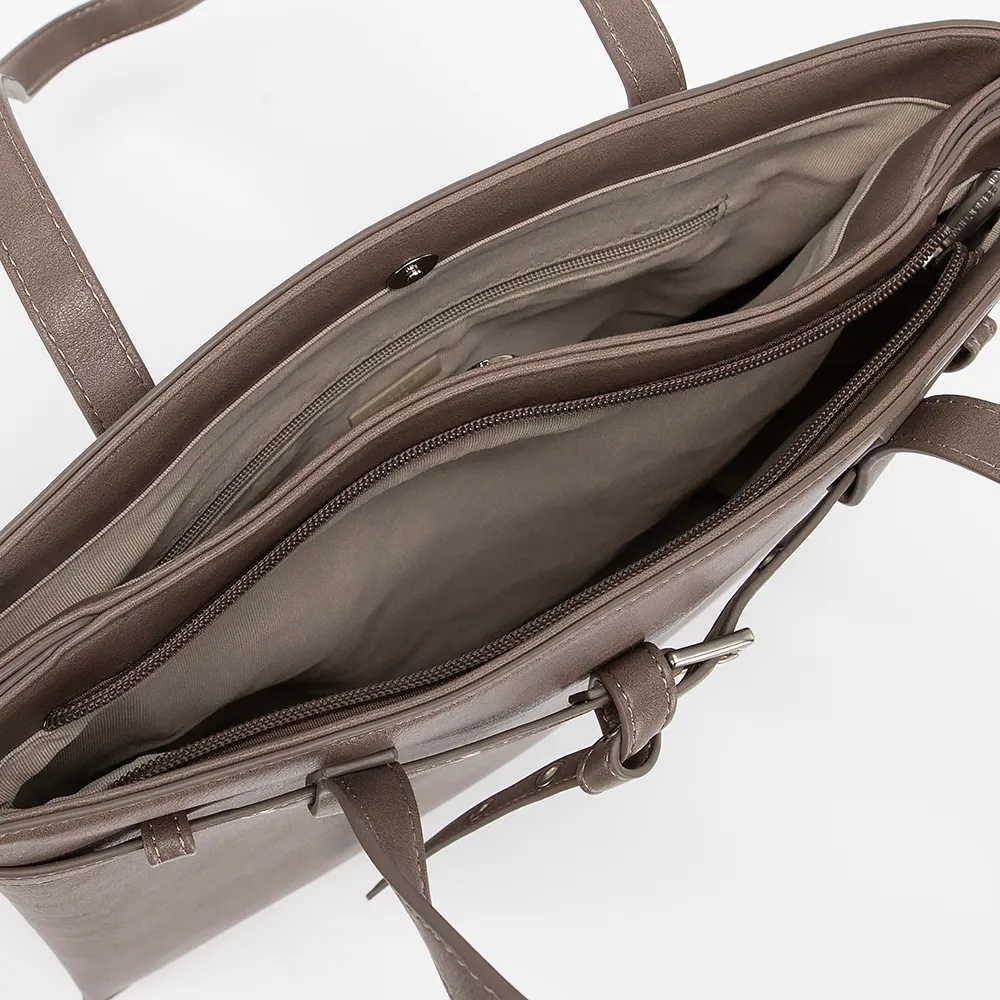 Сумка от торговой марки David Jones выполнена из искусственной кожи кофейного цвета. Модель с двумя длинными ручками. Декорирована тонкими ремешками. Два отделения: одно - на молнии, второе - на магнитной кнопке. Внутри: текстильная подкладка, карман на молнии, накладной карман. На задней стороне - карман на молнии.