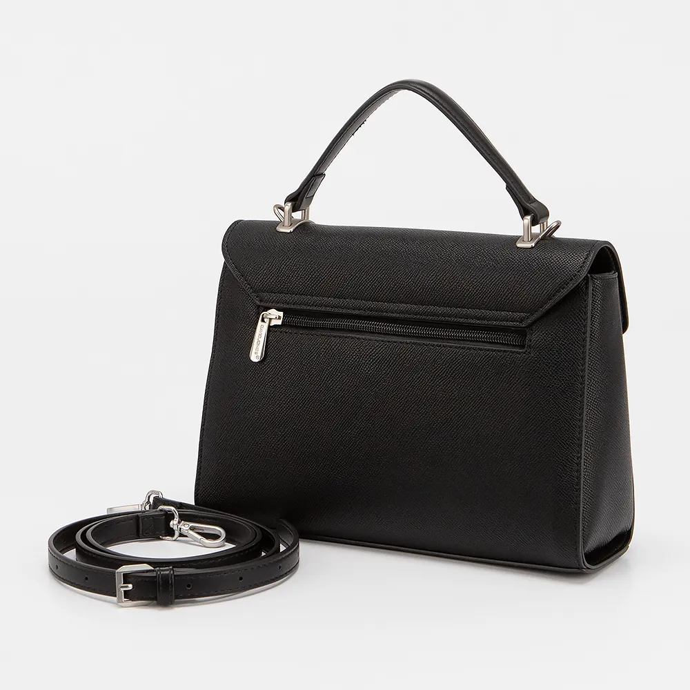 Сумка от торговой марки David Jones выполнена из искусственной кожи черного цвета. Модель с ручкой и длинным регулируемым плечевым ремнем. Клапан на поворотном замке закрывает накладной карман и отделение на молнии. Внутри: текстильная подкладка, карман на молнии, накладной карман. На задней стороне - карман на молнии.
