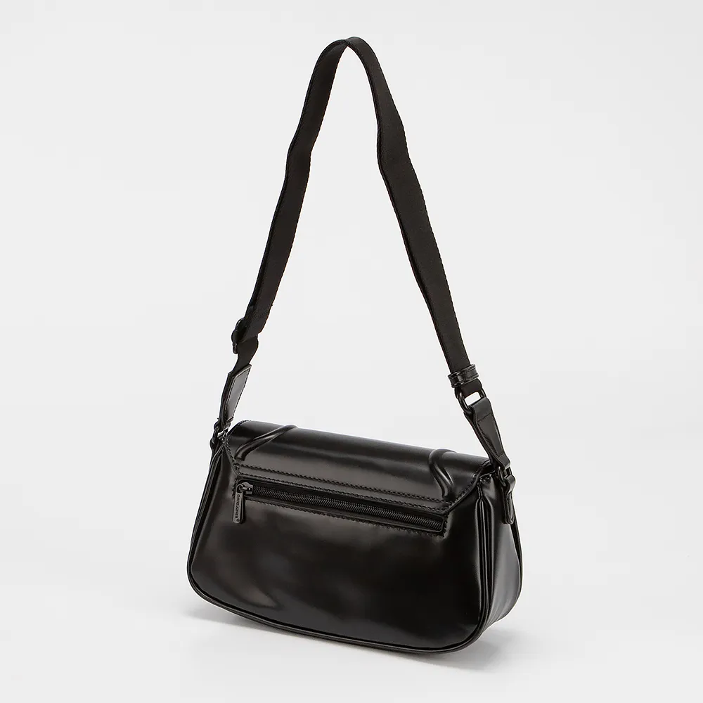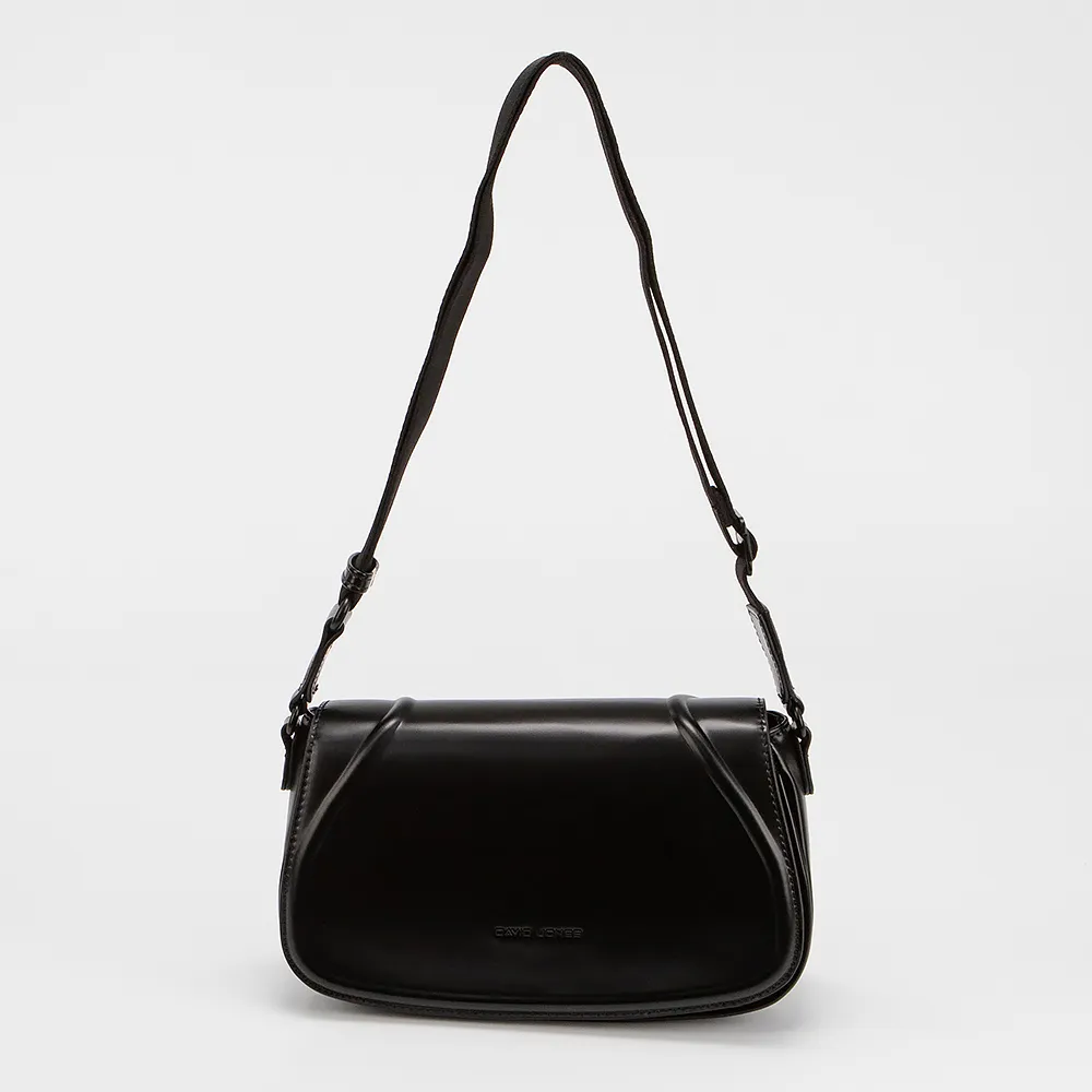 Сумка от торговой марки David Jones выполнена из искусственной кожи черного цвета. Модель с длинным регулируемым плечевым ремнем из текстильного материала. Клапан на магнитной кнопке закрывает отделение на молнии. Внутри: текстильная подкладка, карман на молнии, накладной карман. На задней стороне - карман на молнии.