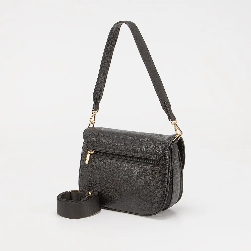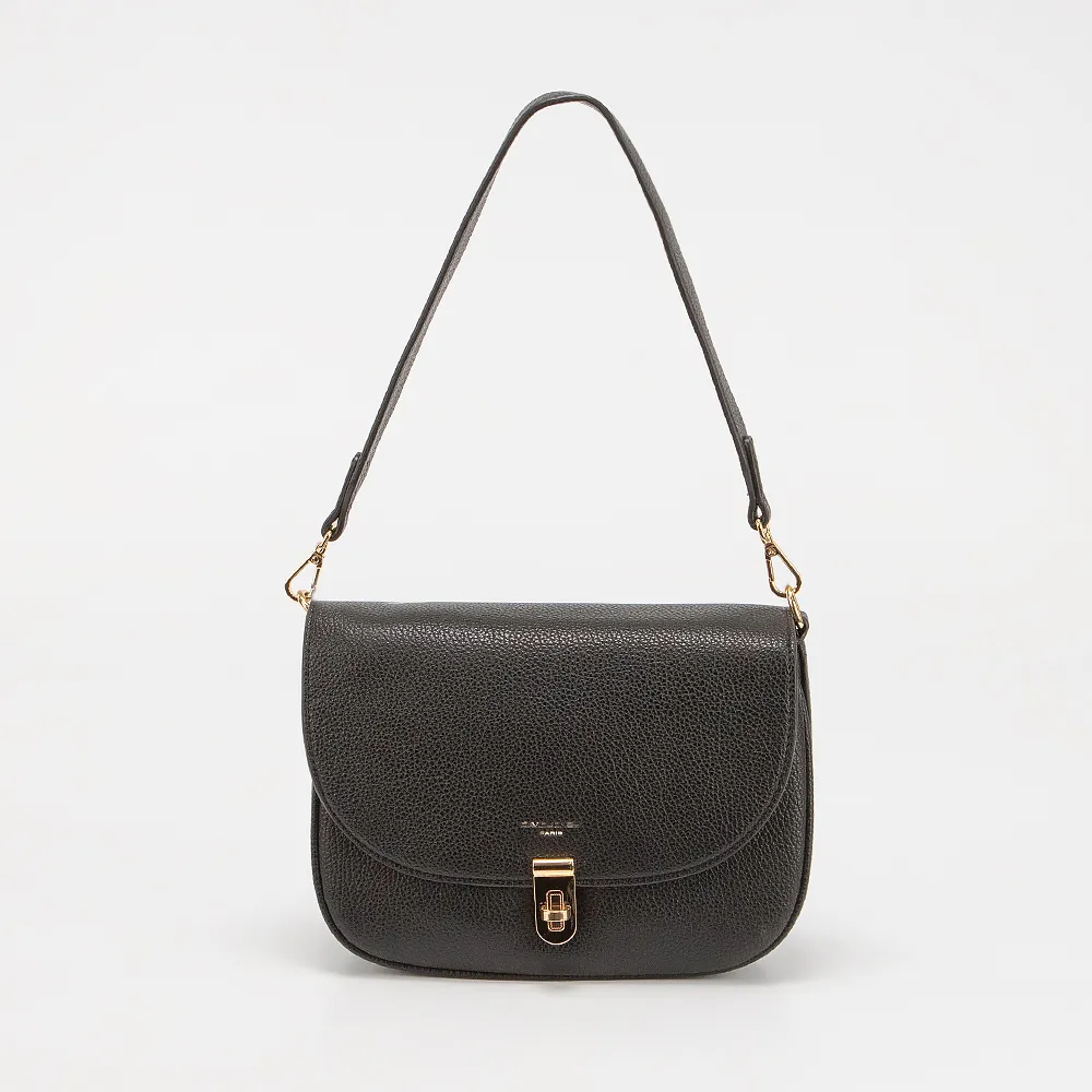 Сумка от торговой марки David Jones выполнена из искусственной кожи черного цвета. Модель с удлиненной ручкой и съемным регулируемым широким плечевым ремнем из текстильного материала. Клапан на поворотном замке закрывает три отделения: среднее - на молнии, боковые - без застежки. Внутри: текстильная подкладка, карман на молнии, накладной карман. На задней стороне - карман на молнии.
