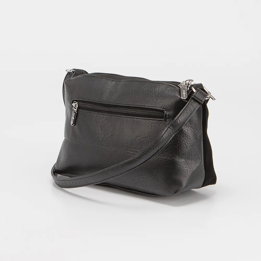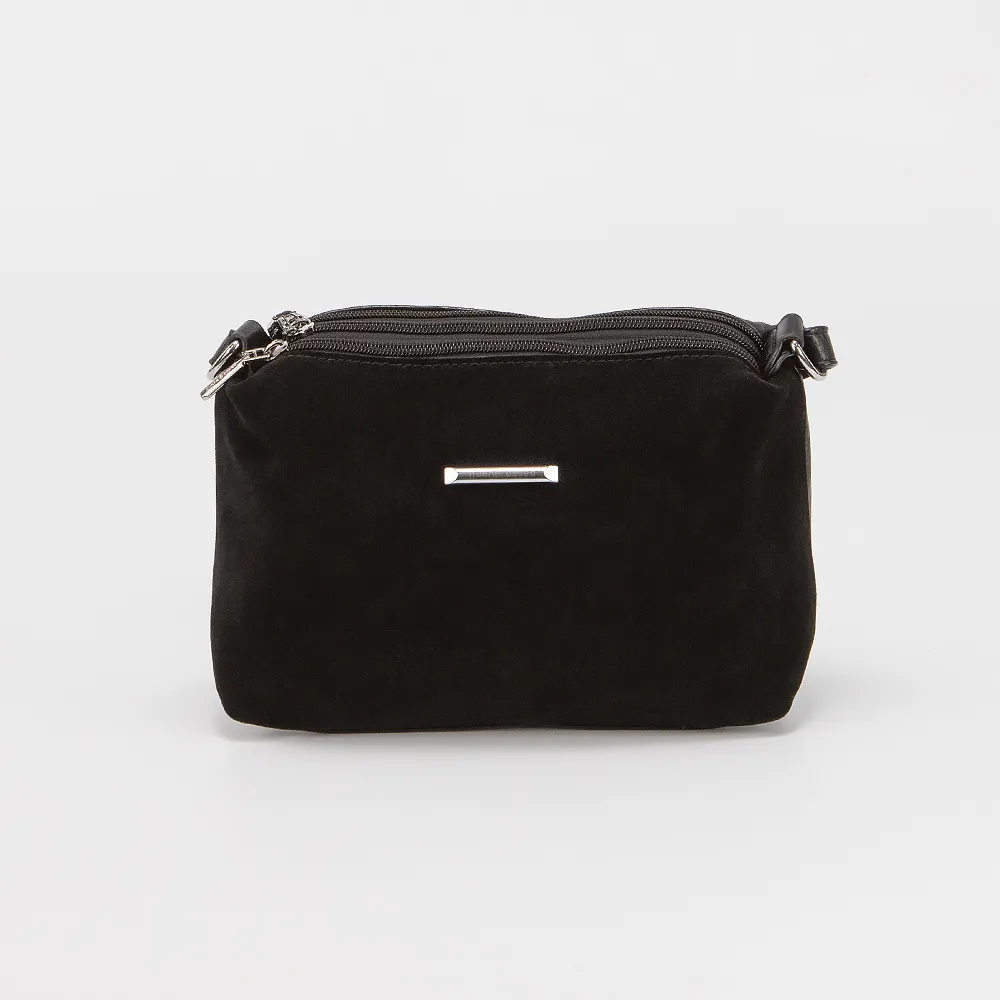Сумка от торговой марки Passo Avanti выполнена из искусственной замши и искусственной кожи черного цвета. Модель с несъемным регулируемым плечевым ремнем. Три отделения на молнии. Внутри: текстильная подкладка, карман на молнии, накладной карман. На задней стороне - карман на молнии.