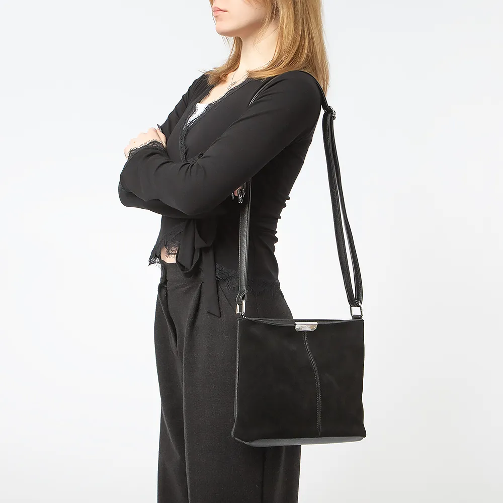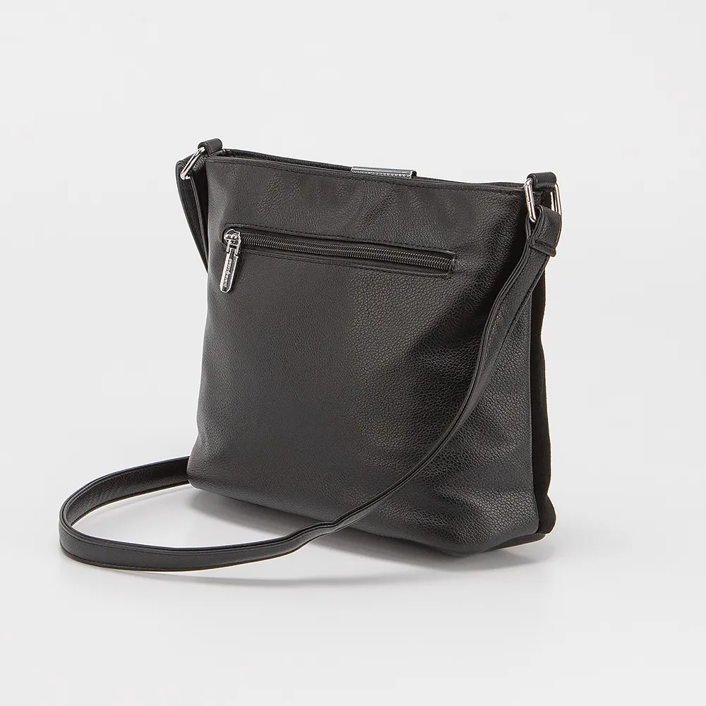 Сумка от торговой марки Passo Avanti из искусственной замши и искусственной кожи черного цвета. Модель с несъемным регулируемым плечевым ремнем. Отделение на молнии. Внутри: текстильная подкладка, карман и средник на молнии, накладной карман. На задней стороне - карман на молнии.