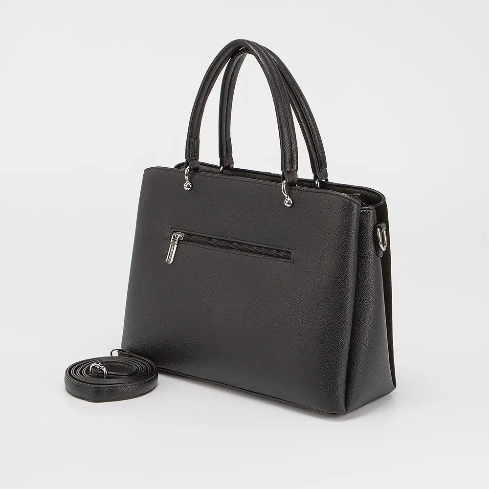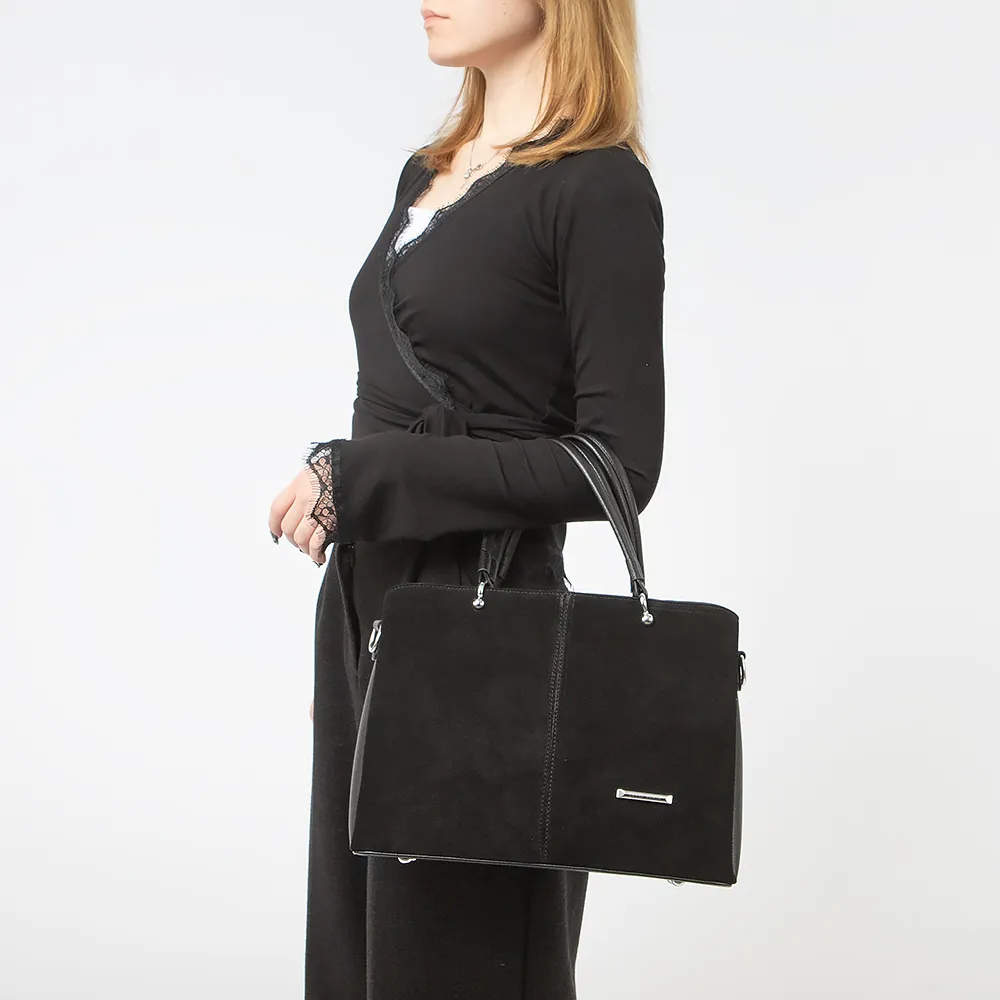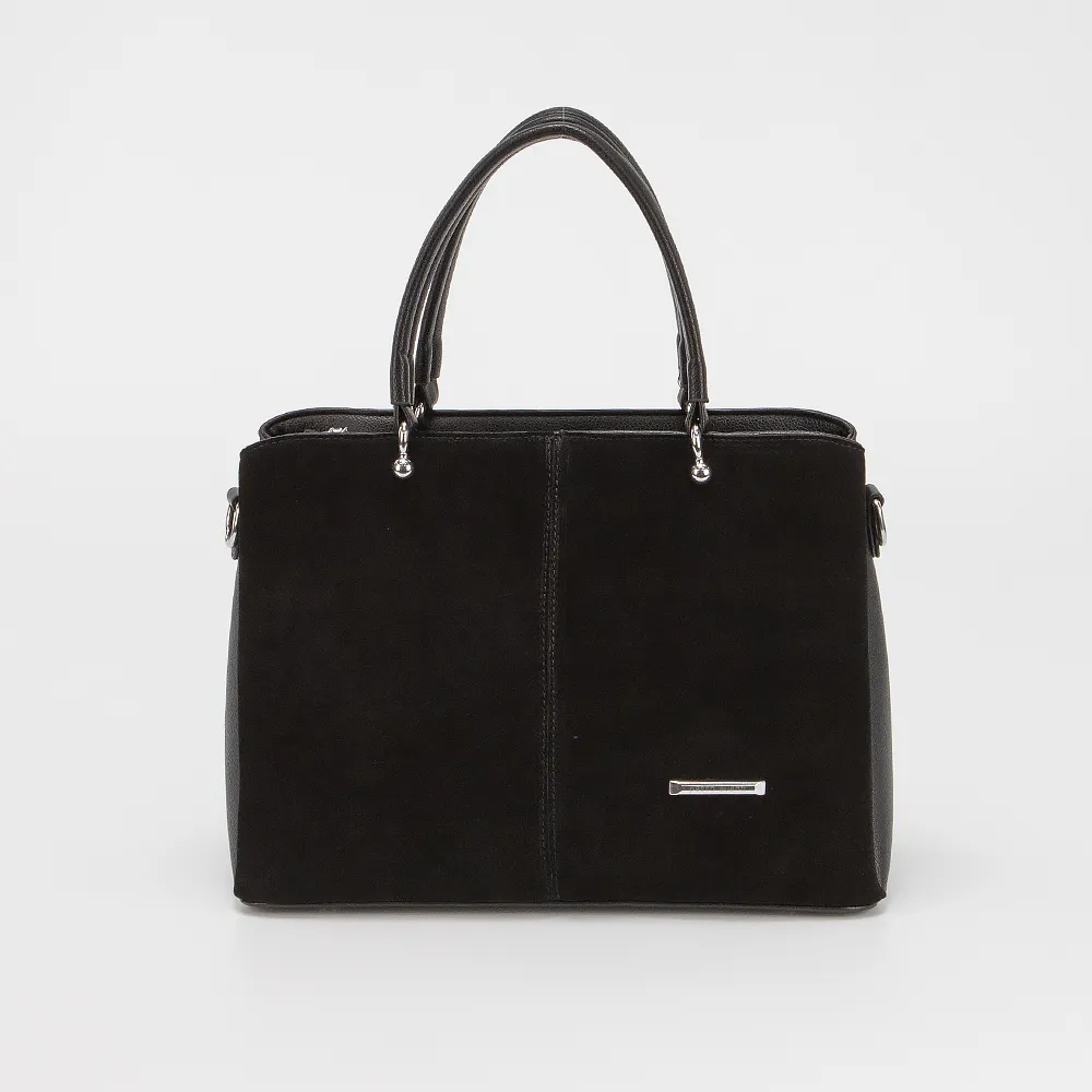 Сумка от торговой марки Passo Avanti из искусственной кожи и искусственной замши черного цвета. Модель с двумя удлиненными ручками и съемным регулируемым плечевым ремнем. Отделение на молнии. Внутри: три отсека, текстильная подкладка, карман на молнии, два накладных кармана. На задней стороне - карман на молнии. Дно оснащено металлическими ножками для защиты от износа.