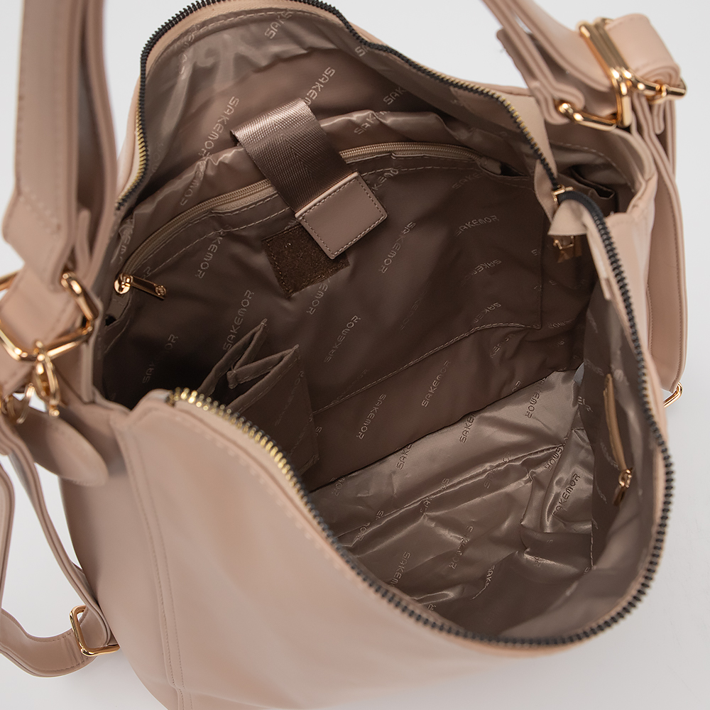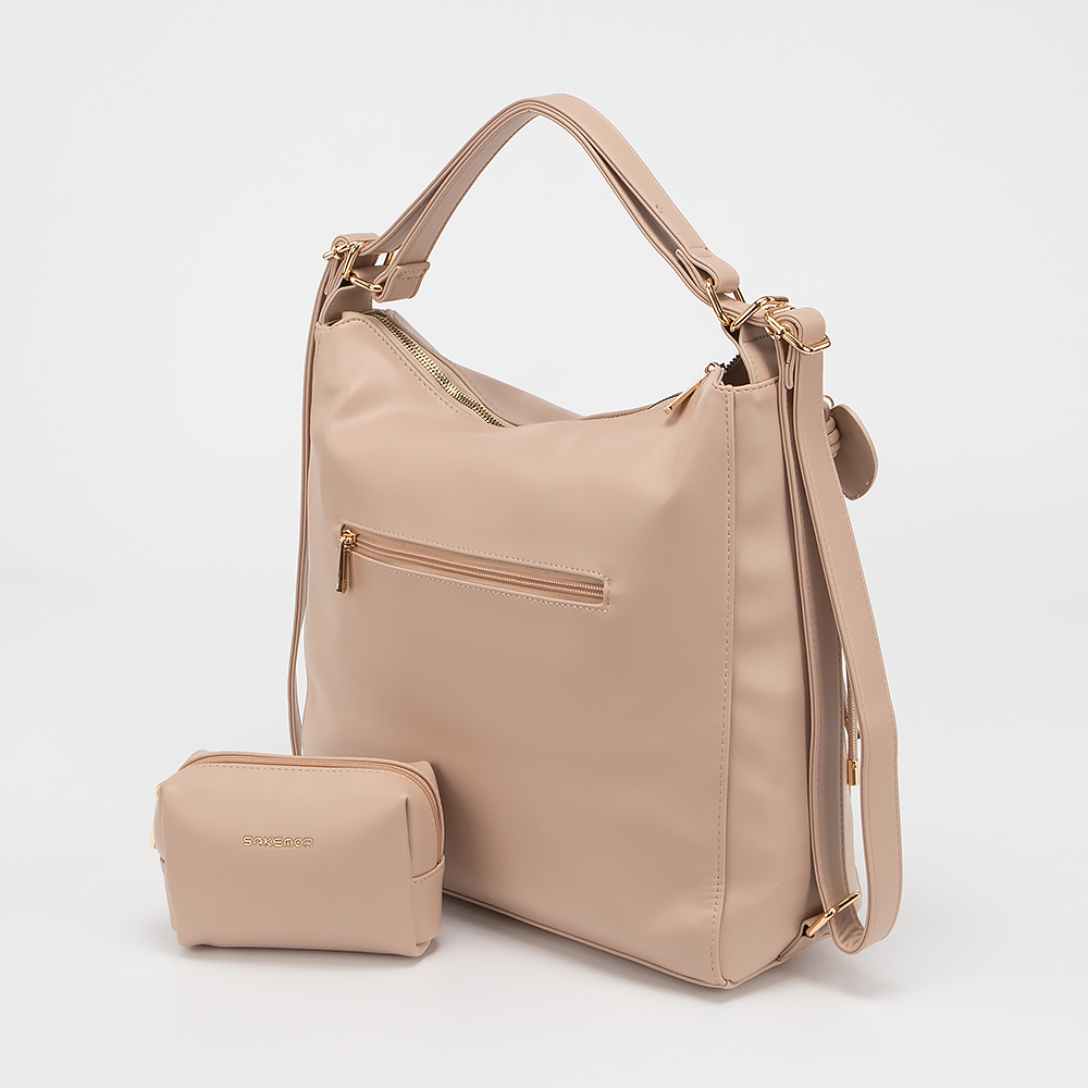 Сумка-рюкзак от торговой марки Sakemor выполнена из искусственной кожи. Модель с ручкой и плечевым ремнем, который стягивается в две плечевые лямки. Отделение на молнии. Внутри: текстильная подкладка, карман на молнии, накладные карманы. На задней стороне - карман на молнии. В комплект входит косметичка.