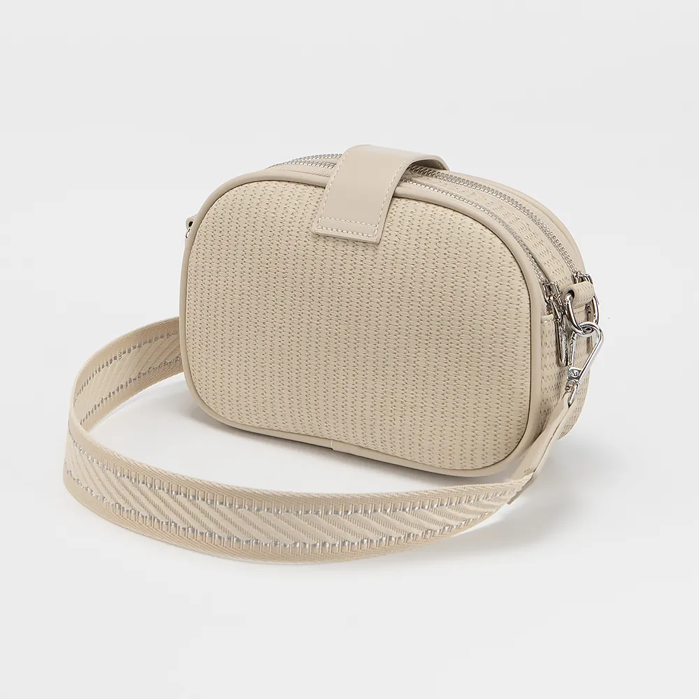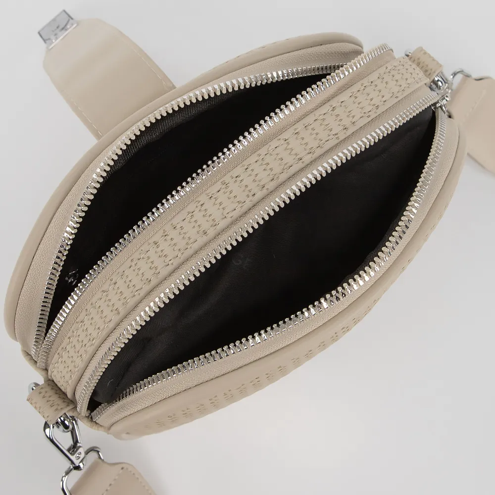 Сумка от торговой марки Valigetti выполнена из искусственной кожи бежевого цвета. Модель с длинным широким плечевым ремнем. Два отделения на молнии, дополнительно закрываются узким клапаном. Внутри: текстильная подкладка, карман на молнии, накладной карман.