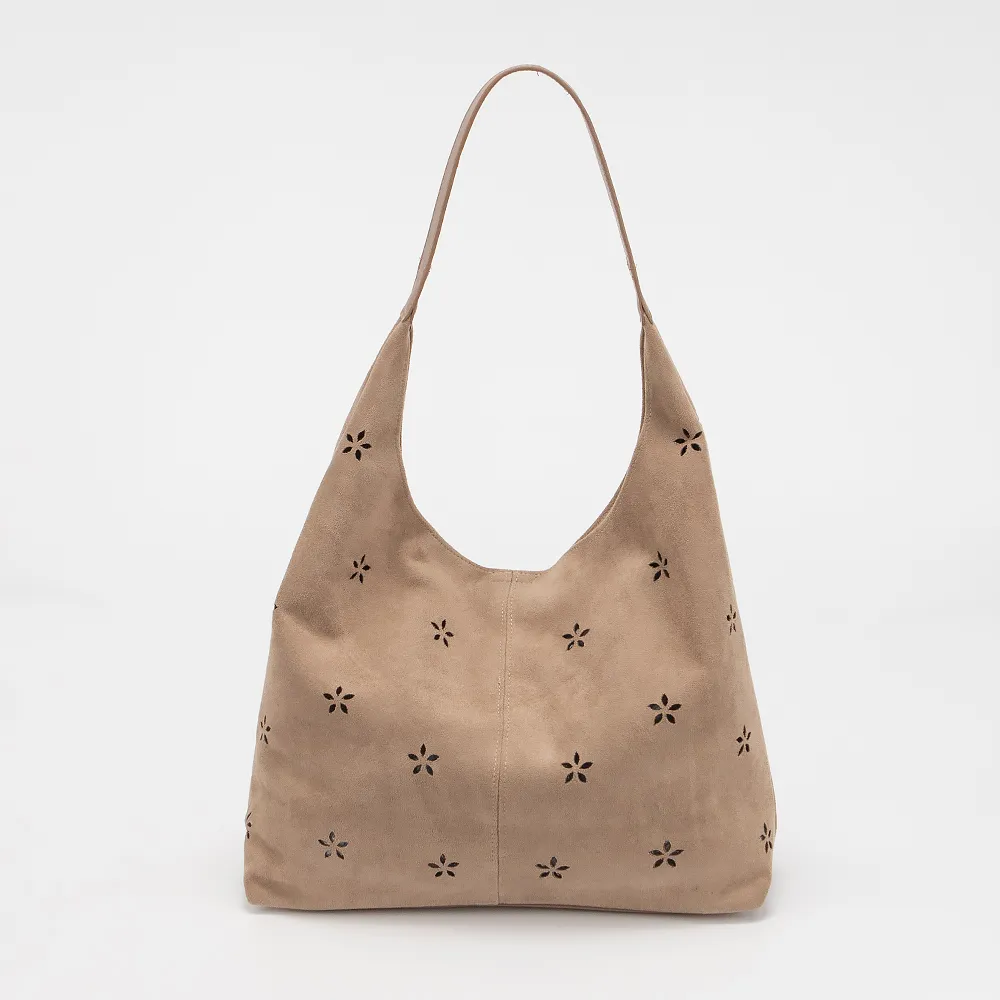 Сумка от торговой марки Valigetti выполнена из искусственной замши. Модель с длинной ручкой, являющейся продолжением сумки. Декорирована перфорацией в виде цветочков. Отделение на магнитной кнопке без подкладки. Внутри имеется компактная сумка-вкладыш на молнии.