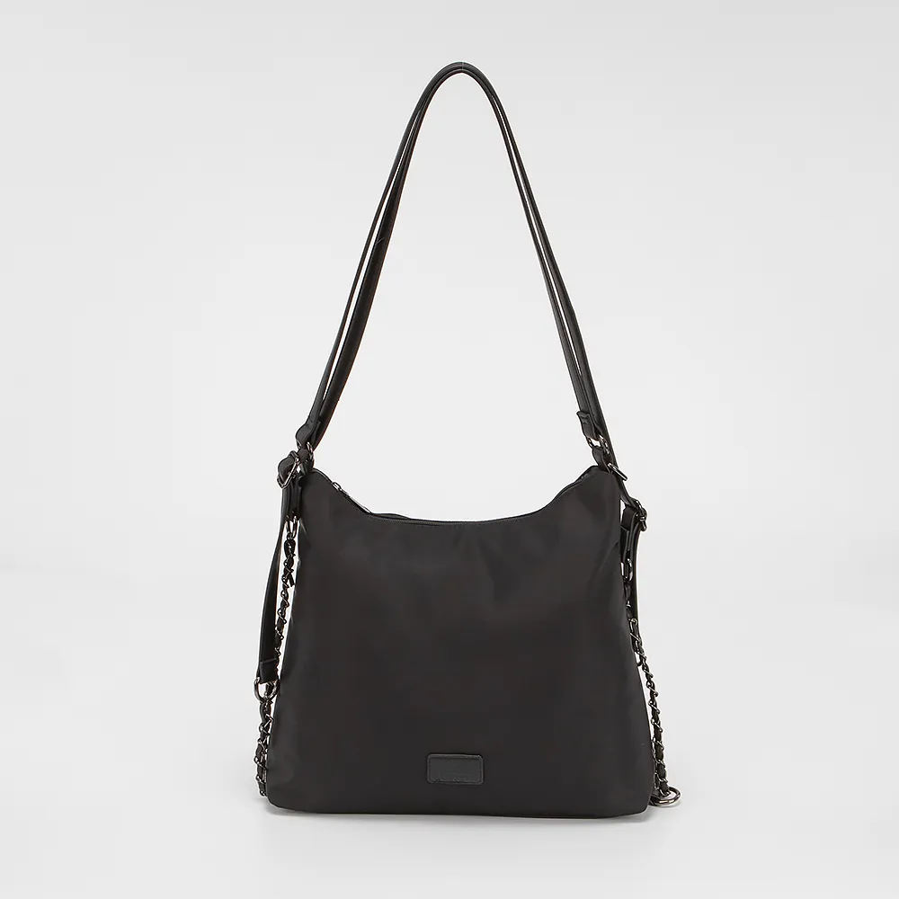 Сумка-рюкзак от торговой марки Valigetti выполнен из текстильного материала черного цвета. Модель с плечевым ремнем, который стягивается в плечевые лямки. Отделение на молнии. Внутри: текстильная подкладка, карман на молнии, накладной карман. На задней стороне - карман на молнии.