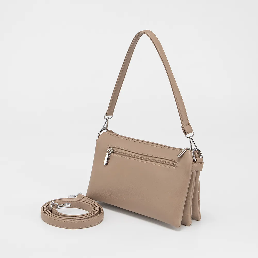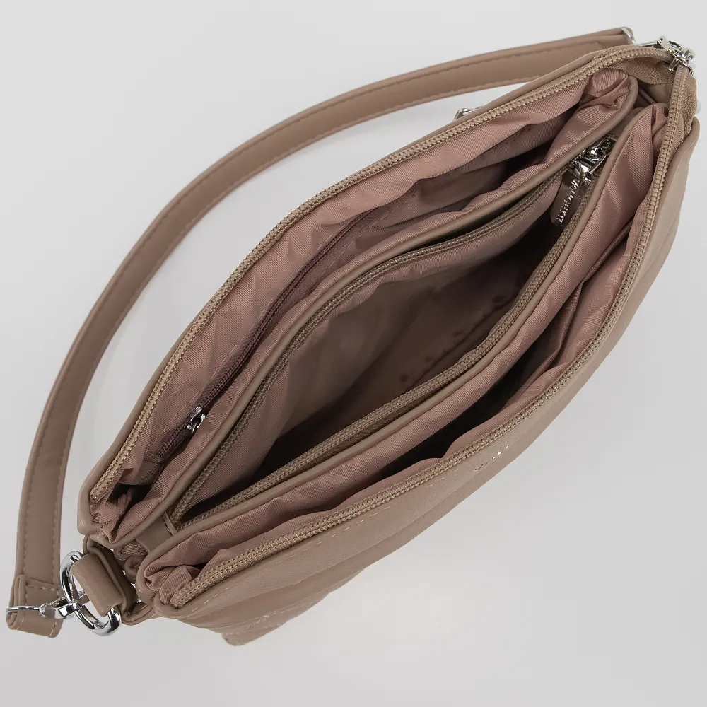 Сумка от торговой марки Valigetti выполнена из искусственной кожи бежевого цвета. Модель с удлиненной ручкой и съемным регулируемым плечевым ремнем. Декорирована стежкой. Отделение на молнии закрывает три отсека: средний - на молнии, боковые - без застежки. Внутри: текстильная подкладка, карман на молнии, накладной карман. На задней стороне - карман на молнии.