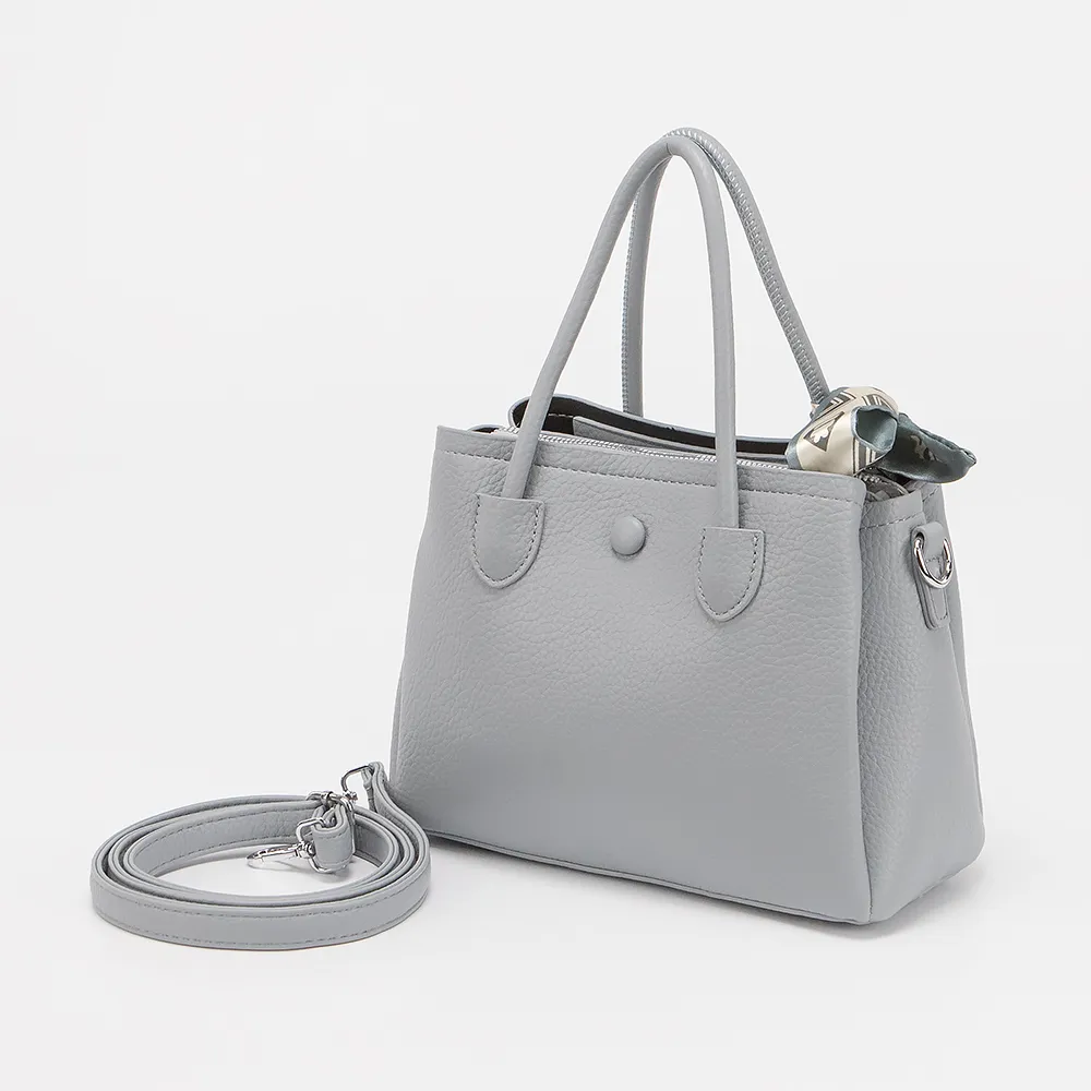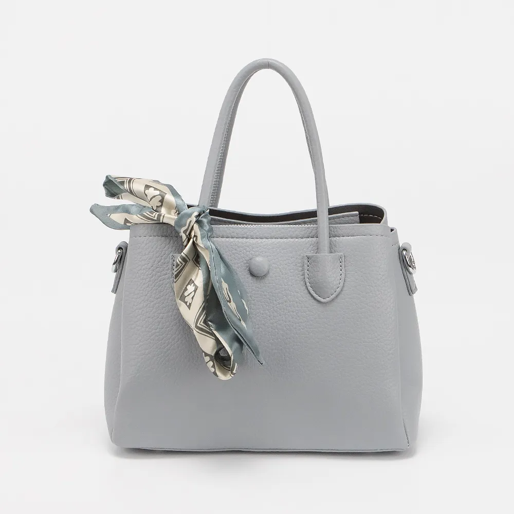 Сумка от торговой марки Valigetti выполнена из искусственной кожи. Модель с двумя ручками и съемным регулируемым плечевым ремнем. Декорирована платком твилли. Три отделения: среднее - на молнии, боковые - на магнитной кнопке. Дно оснащено металлическими ножками для защиты от износа.