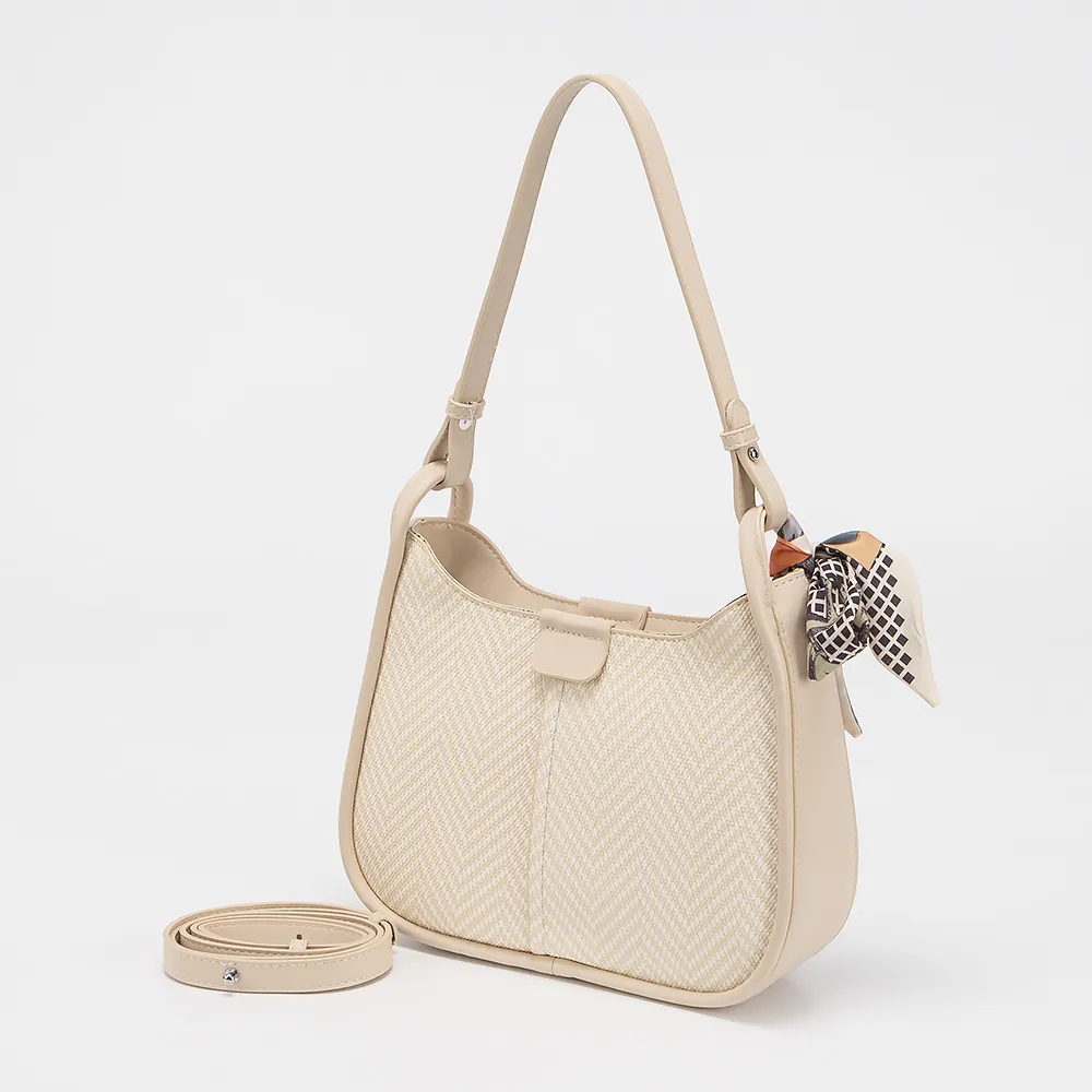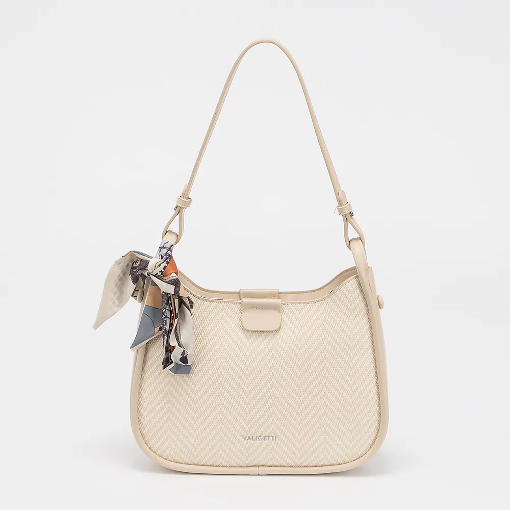 Сумка от торговой марки Valigetti выполнена из искусственной кожи с текстильными вставками с узором. Модель с длинной ручкой и съемным регулириуемым плечевым ремнем. Декорирована платком твилли. Отделение на молнии. Внутри: текстильная подкладка, карман на молнии, накладной карман.