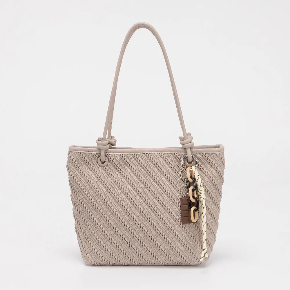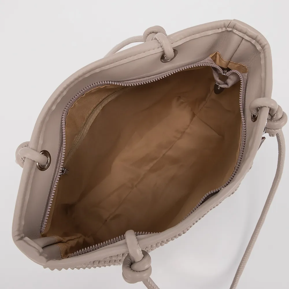 Сумка от торговой марки Valigetti выполнена из искусственной кожи серого цвета с тиснением. Модель с двумя длинными ручками. Декорирована подвеской. Отделение на молнии. Внутри: текстильная подкладка, карман на молнии, накладной карман.
