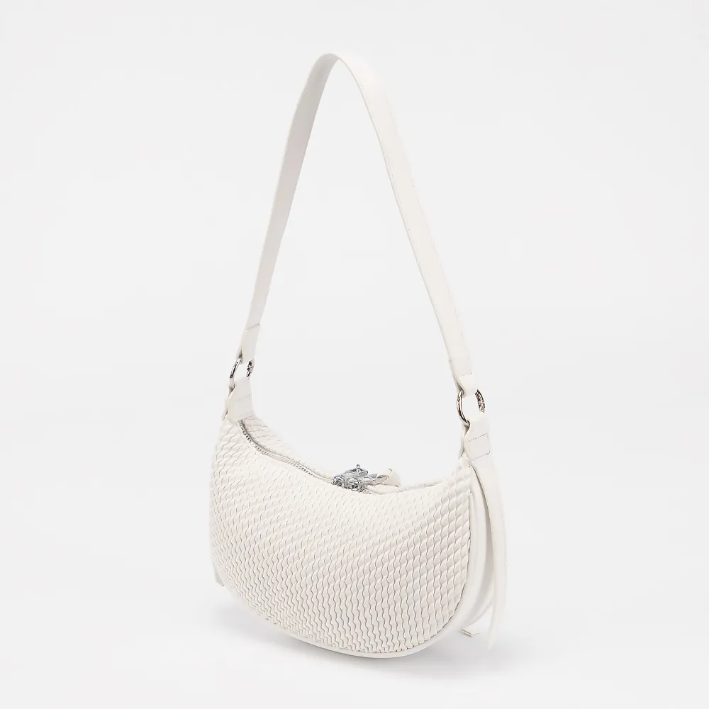 Сумка от торговой марки Valigetti выполнена из искусственной кожи белого цвета с тиснением. Модель с коротким регулируемым плечевым ремнем. Декорирована подвеской. Отделение на молнии. Внутри: текстильная подкладка, карман на молнии.