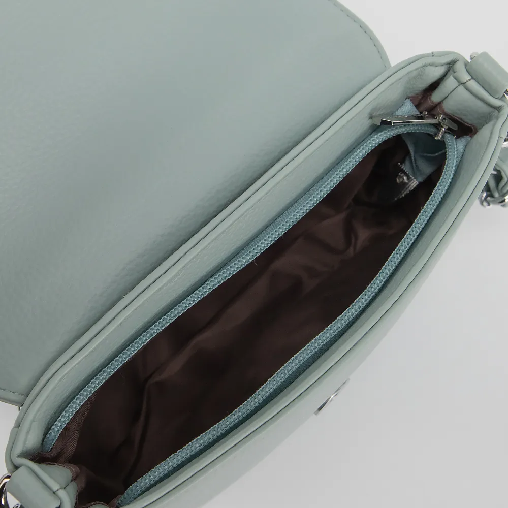 Сумка от торговой марки Valigetti выполнена из искусственной кожи голубого цвета. Компактная модель с длинным регулируемым плечевым ремнем. Клапан закрывает отделение на молнии. Внутри: текстильная подкладка, карман и средник на молнии, накладной карман.