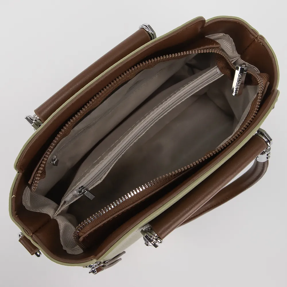 Сумка от торговой марки Valigetti выполнена из искусственной кожи зеленого цвета. Модель с двумя ручками и съемным регулируемым плечевым ремнем. Отделение на молнии. Внутри: текстильная подкладка, карман и средник на молнии, накладной карман.