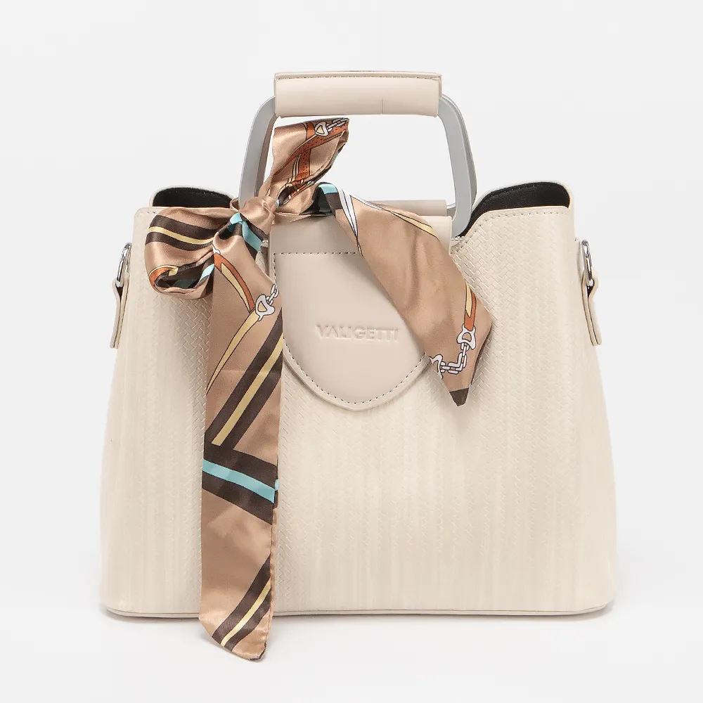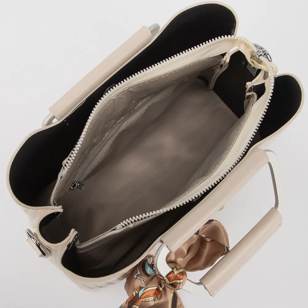 Сумка от торговой марки Valigetti выполнена из искусственной кожи бежевого цвета с тиснением под плетение. Модель с двумя ручками и съемным регулируемым плечевым ремнем. Три отделения: среднее - на молнии, боковые - на магнитной кнопке. Внутри: текстильная подкладка, карман на молнии, накладной карман.