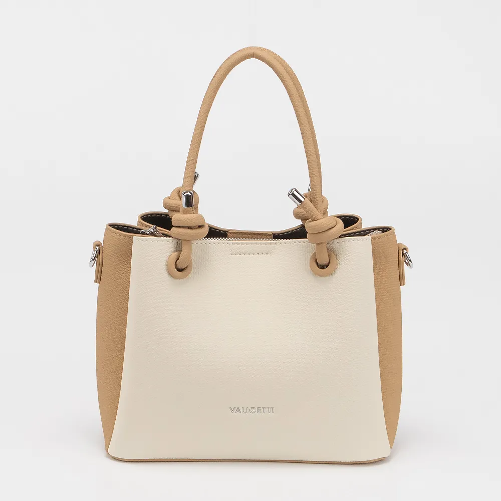 Сумка от торговой марки Valigetti выполнена из искусственной кожи бежевого цвета. Модель с двумя ручками, декорированными узлами и съемным регулируемым плечевым ремнем. Три отделения: среднее - на молнии, боковые - на магнитной кнопке. Внутри: текстильная подкладка, карман на молнии, накладной карман.