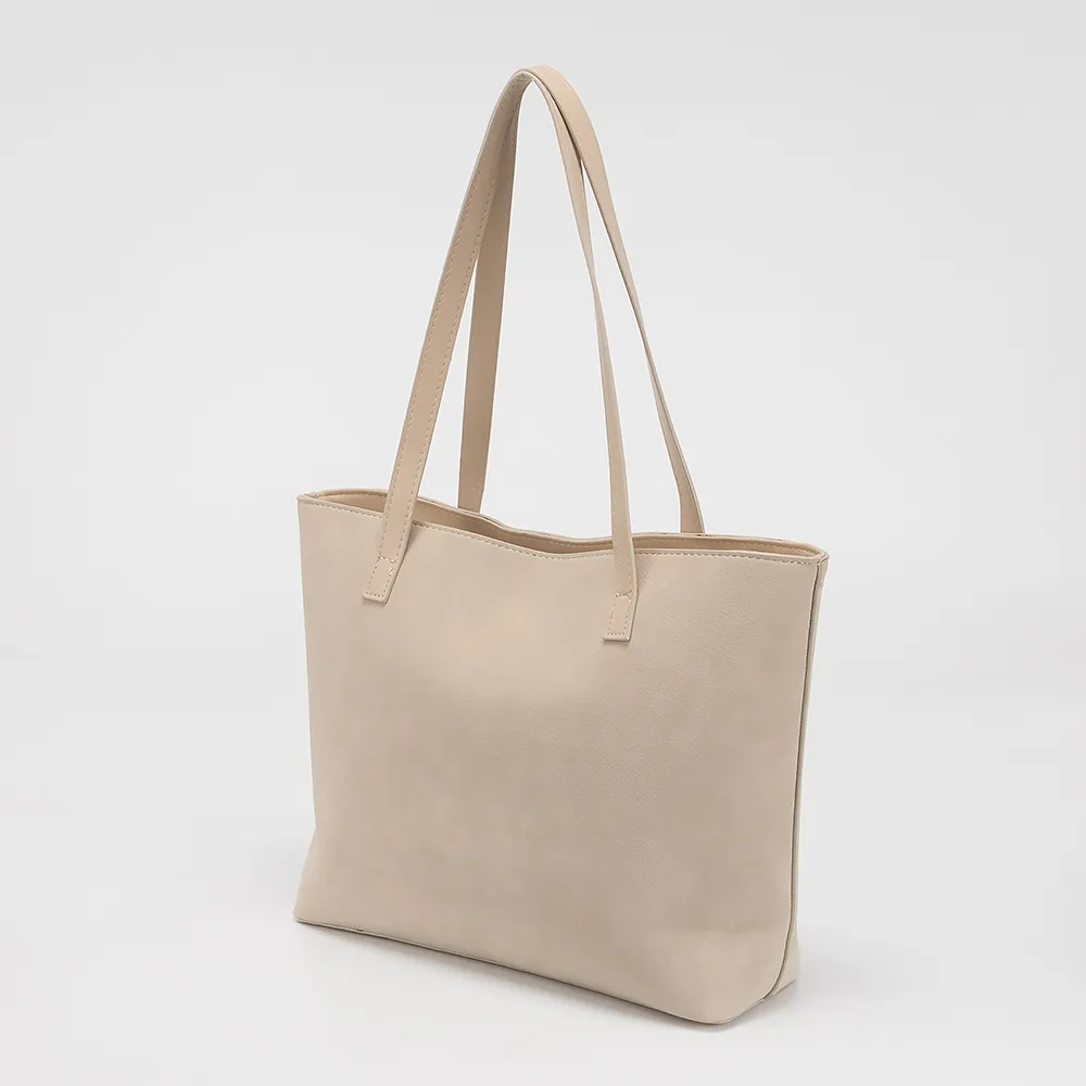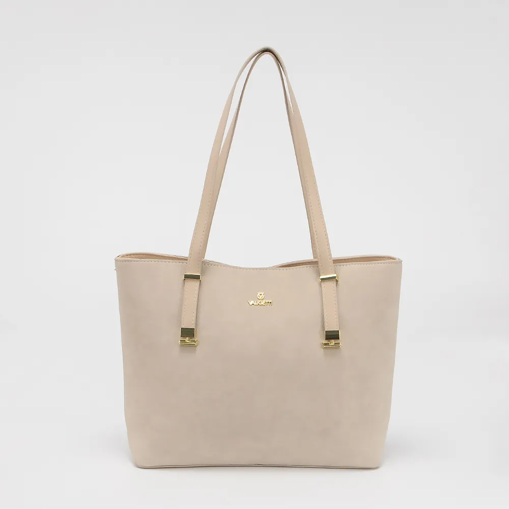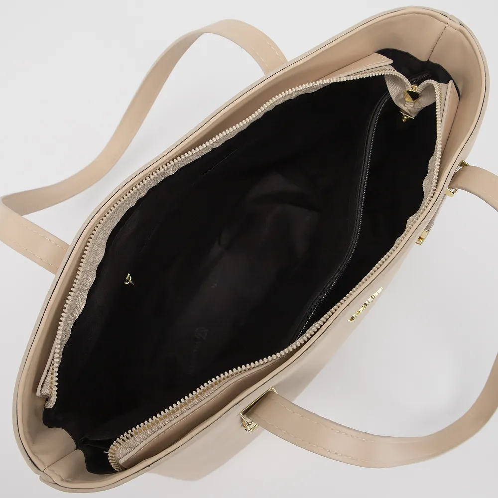 Сумка от торговой марки Valigetti выполнена из искусственной кожи бежевого цвета. Модель с двумя длинными ручками. Отделение на молнии. Внутри: текстильная подкладка, карман и средник на молнии, накладной карман.