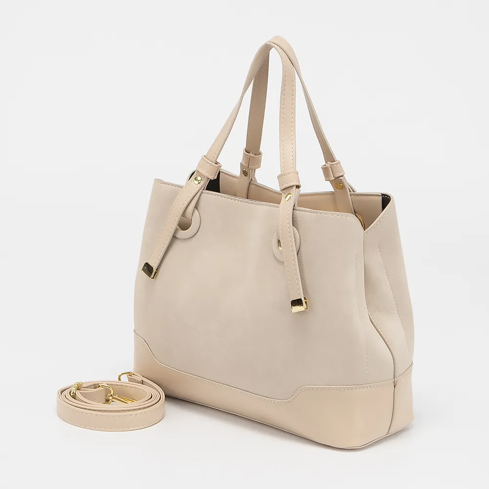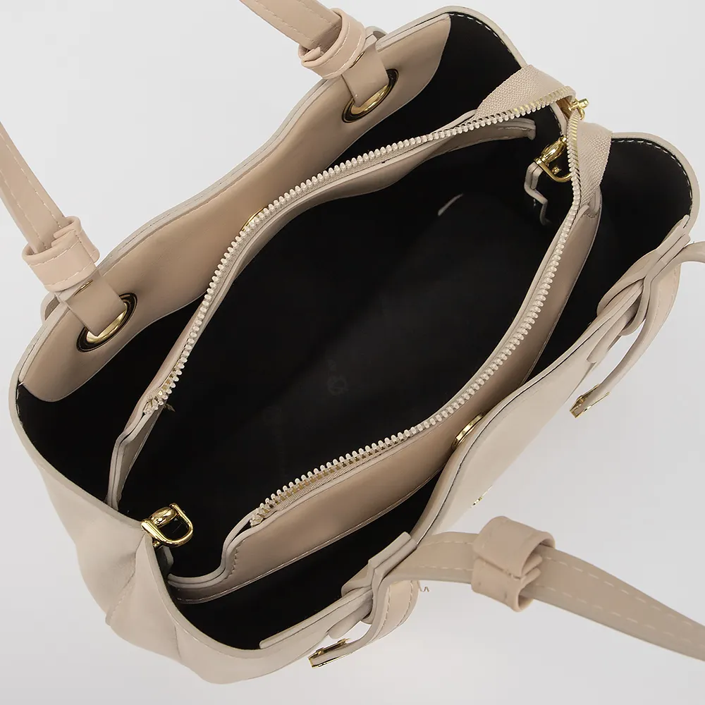 Сумка от торговой марки Valigetti выполнена из искусственной кожи бежевого цвета. Модель с двумя ручками и съемным регулируемым плечевым ремнем. Три отделения: среднее - на молнии, боковые - на магнитной кнопке. Внутри: текстильная подкладка.
