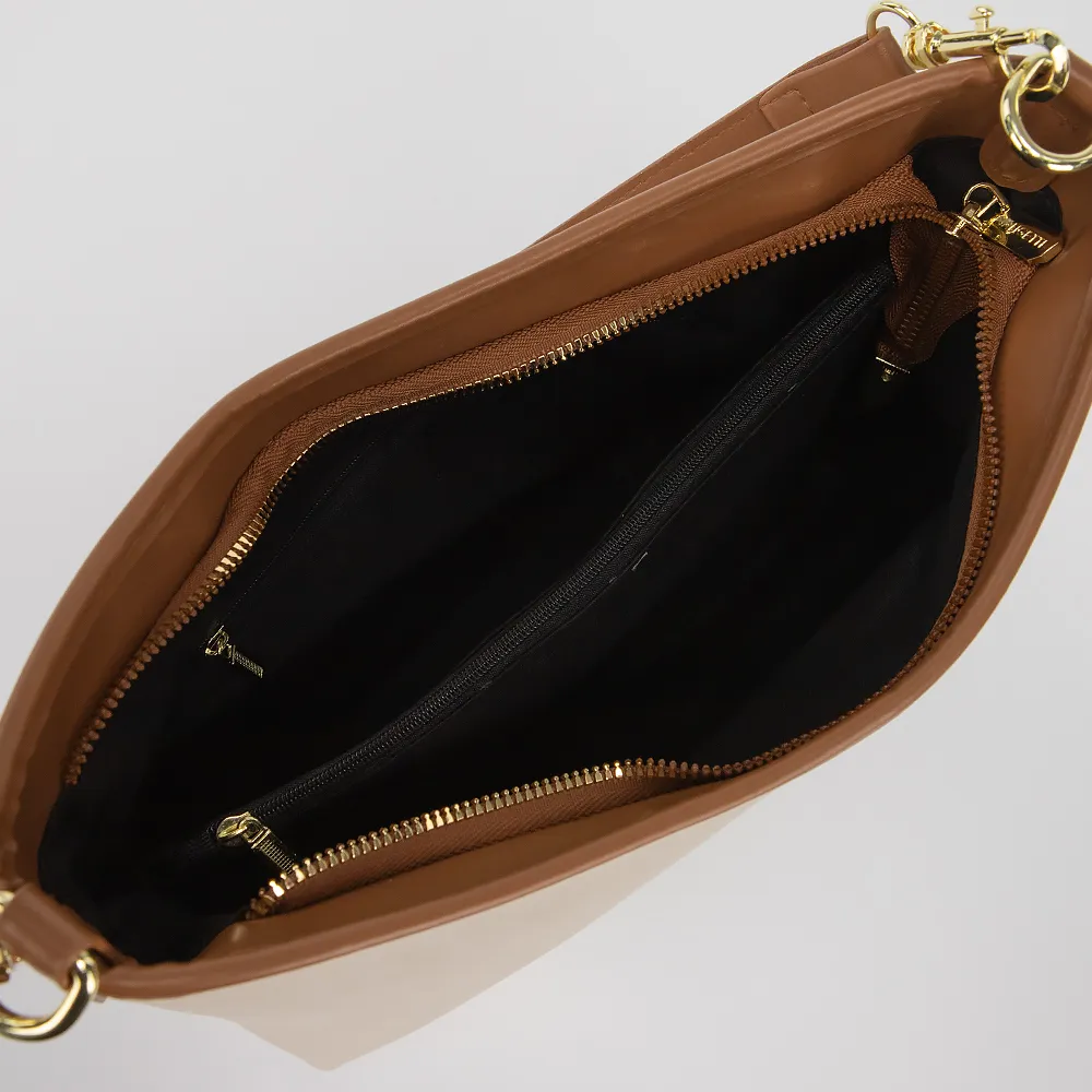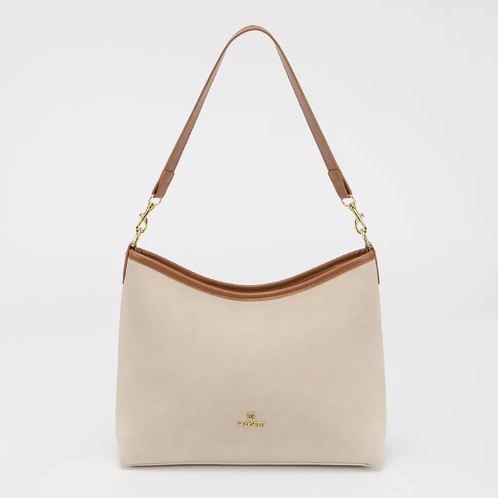Сумка от торговой марки Valigetti выполнена из искусственной кожи бежевого цвета. Модель с удлиненной ручкой и съемным регулируемым плечевым ремнем. Отделение на молнии. Внутри: текстильная подкладка, карман и средник на молнии, накладной карман.