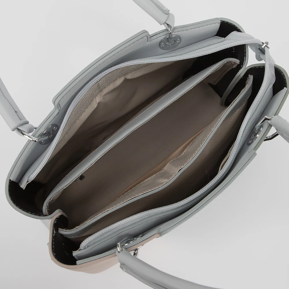 Сумка от бренда Valigetti выполнена из искусственной кожи в сочетании трех цветов. Модель с двумя ручками и съемным регулируемым плечевым ремнем. Молния закрывает три отделения. Внутри: текстильная подкладка, карман на молнии, накладной карман. На задней стороне — карман на молнии. Дно оснащено металлическими ножками для защиты от износа.