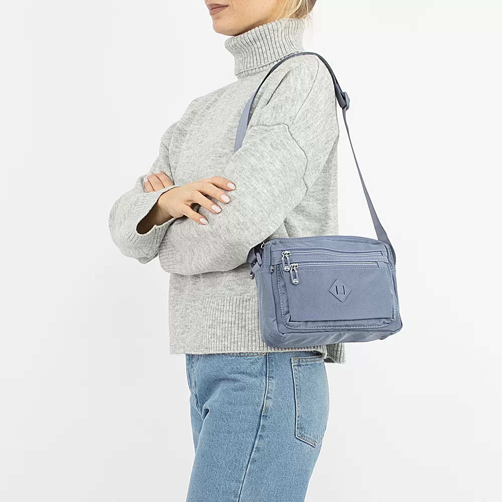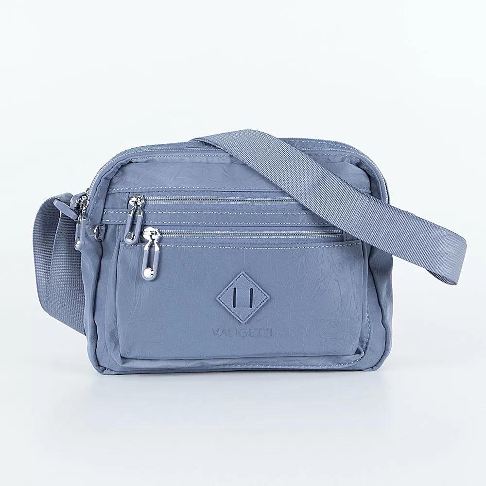 Компактная сумка-планшет бренда Valigetti выполнена в голубом цвете. Сумка оснащена несъемным регулируемым плечевым ремнем и тремя внешними карманами быстрого доступа на молнии с металлической фурнитурой - два спереди и один сзади. У сумки есть два основных отделения на молнии, внутри одного из которых потайной карман на молнии, а в другом - два накладных кармана для мелочей.