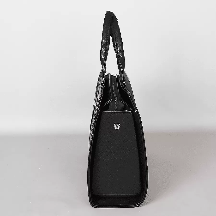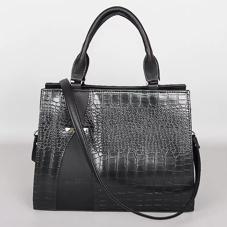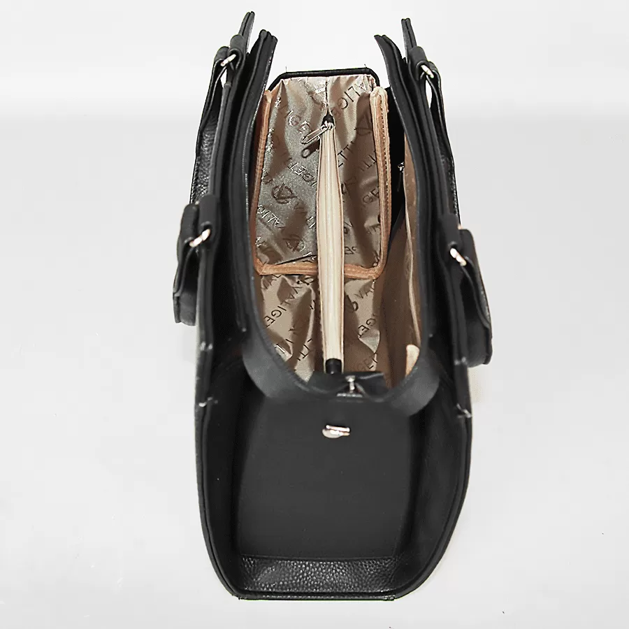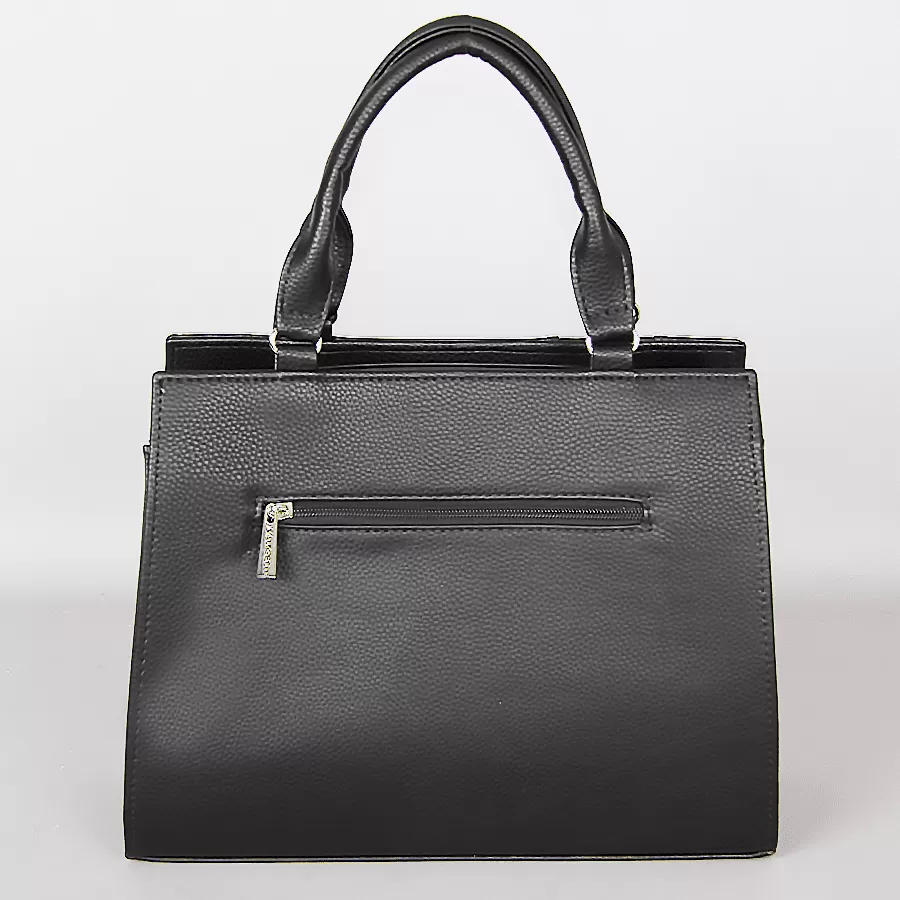 Сумка из искусственной кожи бренда Valigetti выполнена в черном цвете. Это стильная модель с двумя ручками и съемным регулируемым плечевым ремнем. На спинке сумки есть карман быстрого доступа на молнии. Одно основное отделение с фирменной подкладкой внутри имеет один карман на молнии, средний карман на молнии и два накладных кармана.