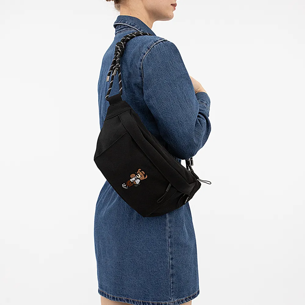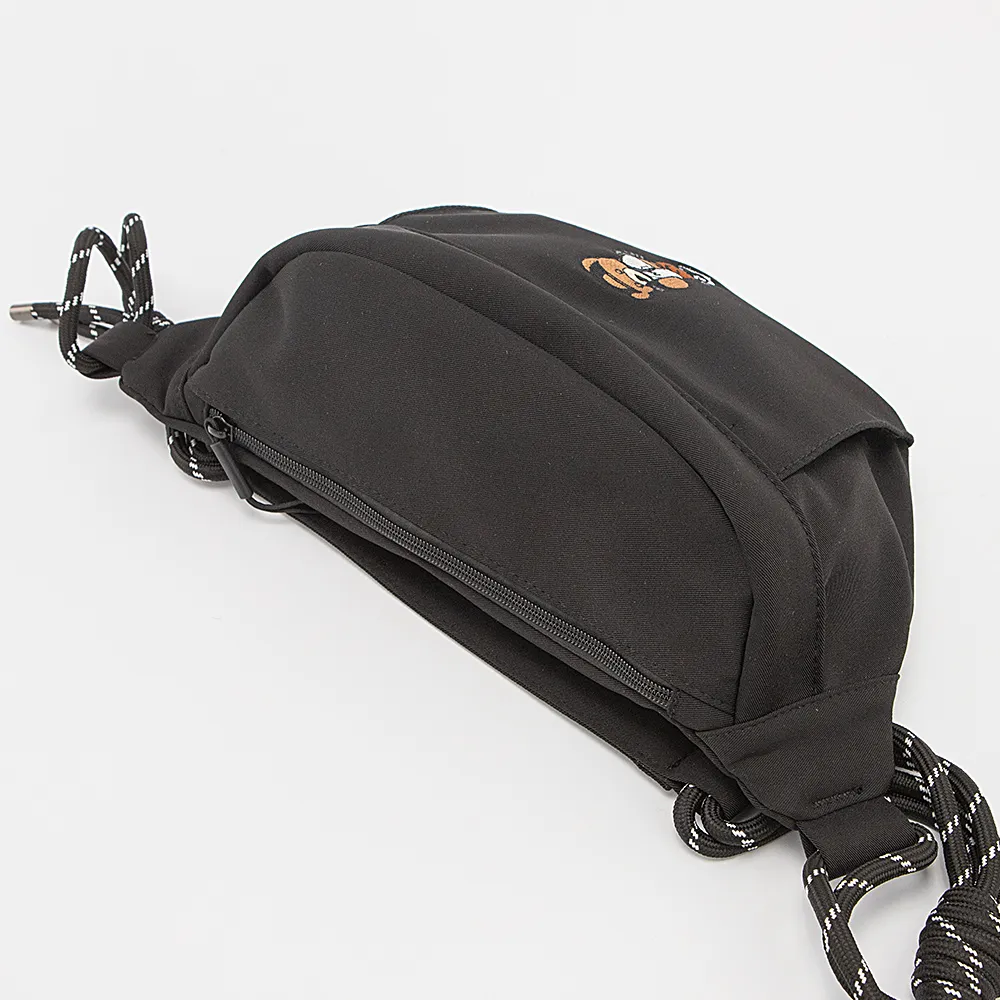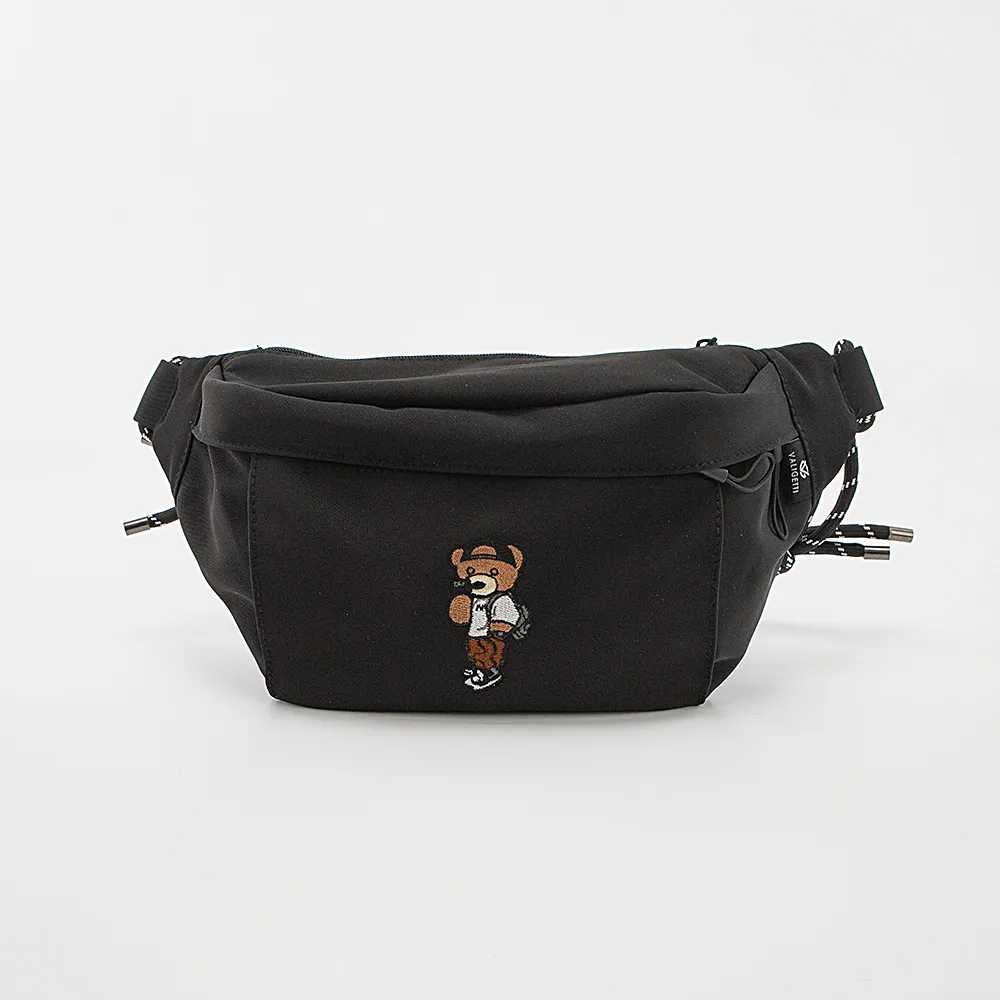 Сумка на пояс от торговой марки Valigetti из практичного материала черного цвета. Вместительная модель с оригинальным съемным ремнем, комбинированным прочными веревками. Два отделения на молнии, с текстильной подкладкой. В переднем отделении – карман на молнии, перегородка с карманом на молнии, образующая накладной карман; в заднем – накладной карман. На лицевой стороне, декорированной аппликацией в виде мишки, имеется карман на молнии. Молодежная текстильная коллекция представлена моделями, выполненными из трех видов материалов: прочной ткани рип-стоп, блестящего и матового текстиля. Фурнитура повышенной прочности обеспечивает плавность движения замка и долговечность использования.