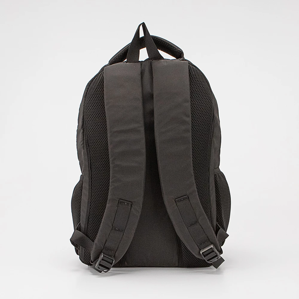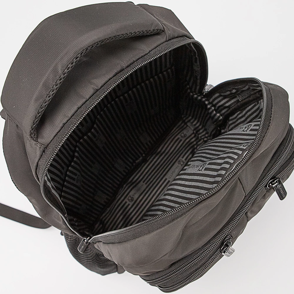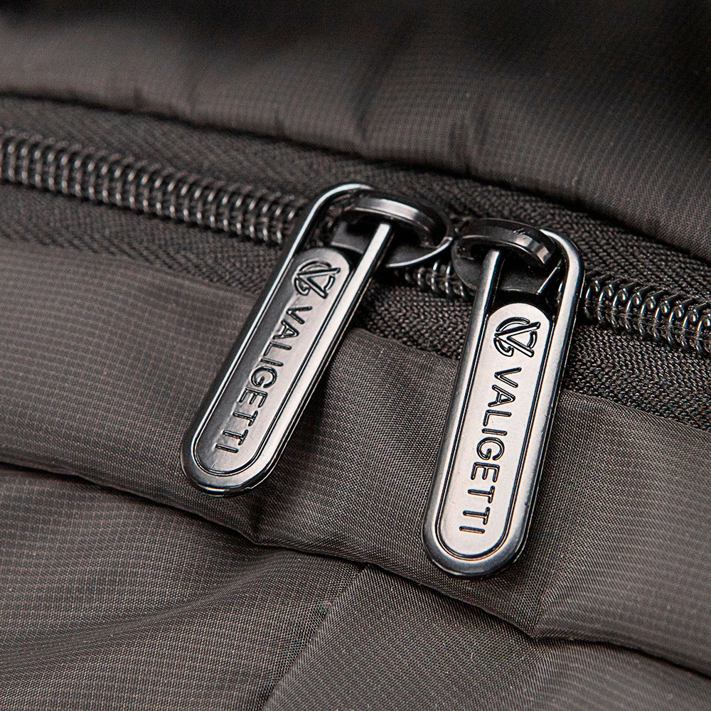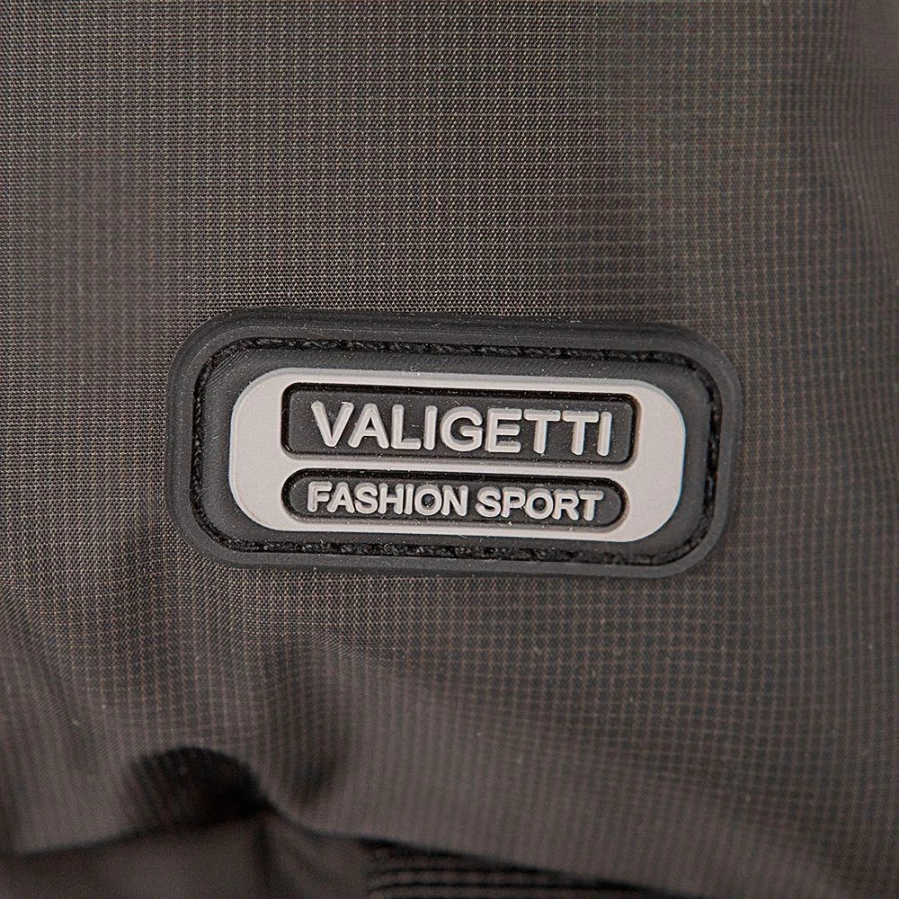 Рюкзак от бренда Valigetti из прочного практичного текстильного материала черного цвета. Модель с лямкой-переноской и регулируемыми плечевыми ремнями. Два отделения на молнии с текстильной подкладкой. Основное отделение имеет накладной карман с уплотненной стенкой. Передний карман оснащен двумя накладными карманами. На лицевой стороне – два кармана на молнии. По бокам расположены сетчатые карманы. Спина с дышащим сетчатым верхом. Снизу – стягивающие ремни.