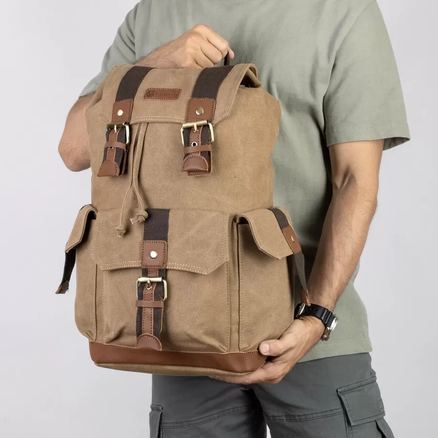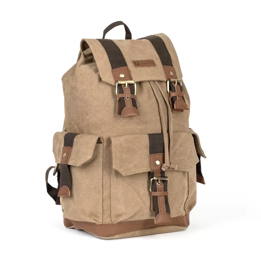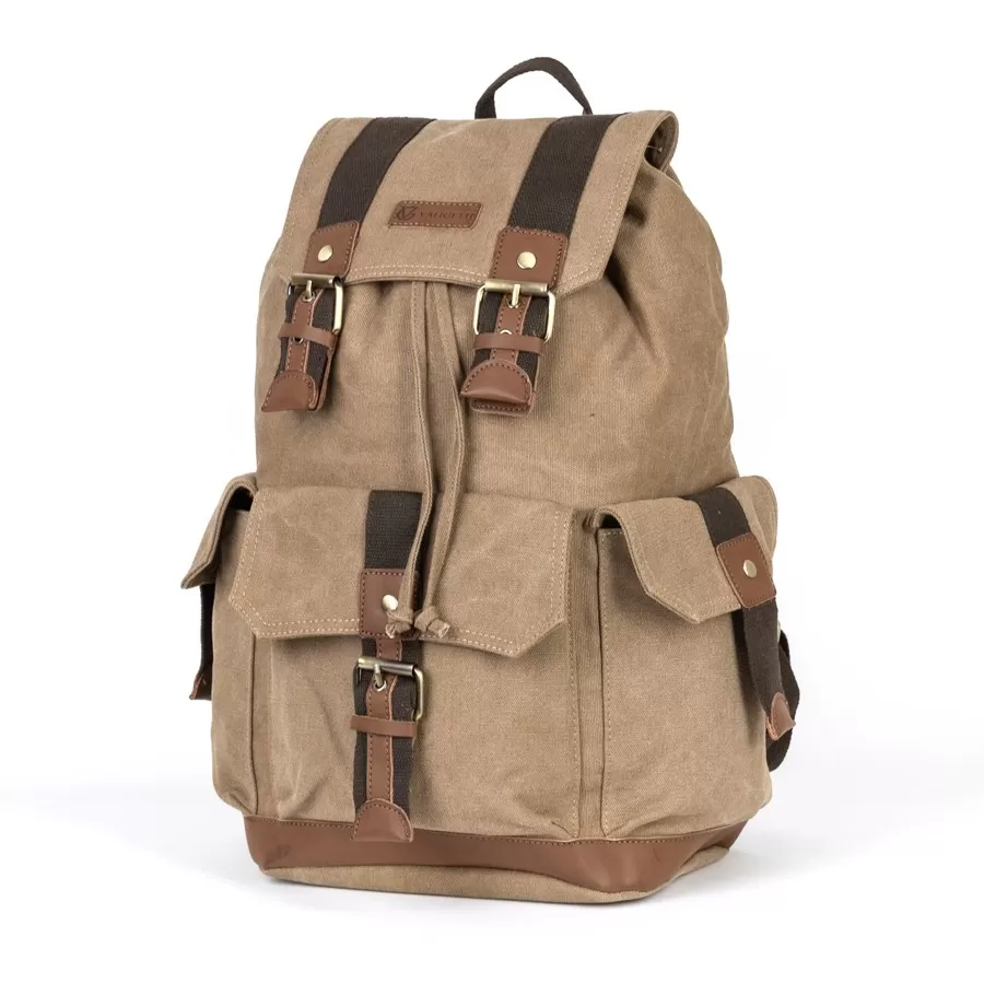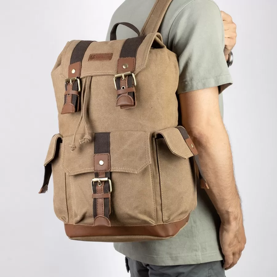 Рюкзак от торговой марки Valigetti выполнен из прочного текстильного материала цвета хаки. Модель с лямкой для переноски и регулируемыми плечевыми ремнями. Отделение закрывается клапаном на магнитных кнопках и стягивается шнуром. Внутри: текстильная подкладка. На лицевой стороне и по бокам - накладной карман с клапаном, декорированный пряжкой.