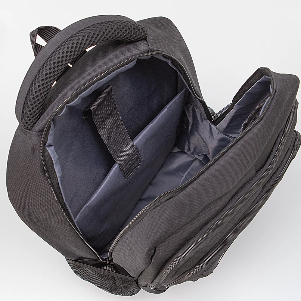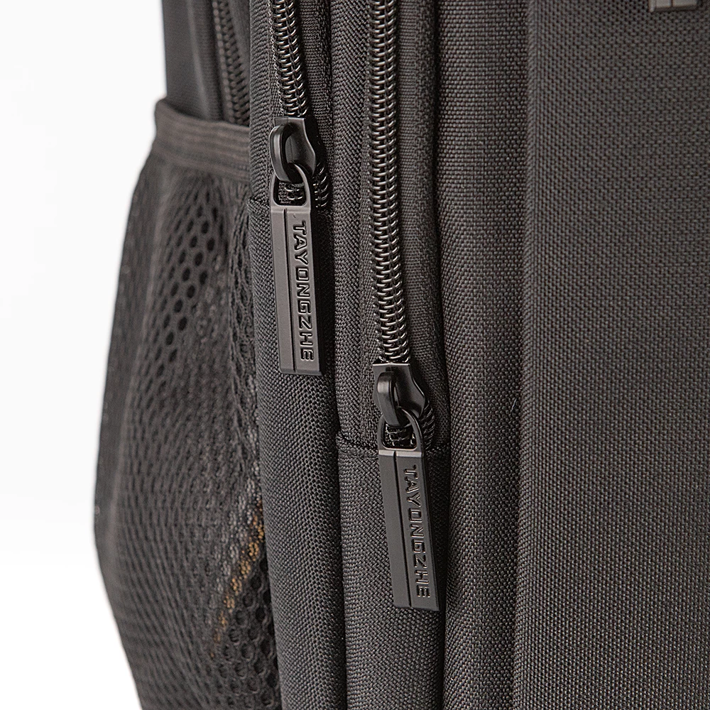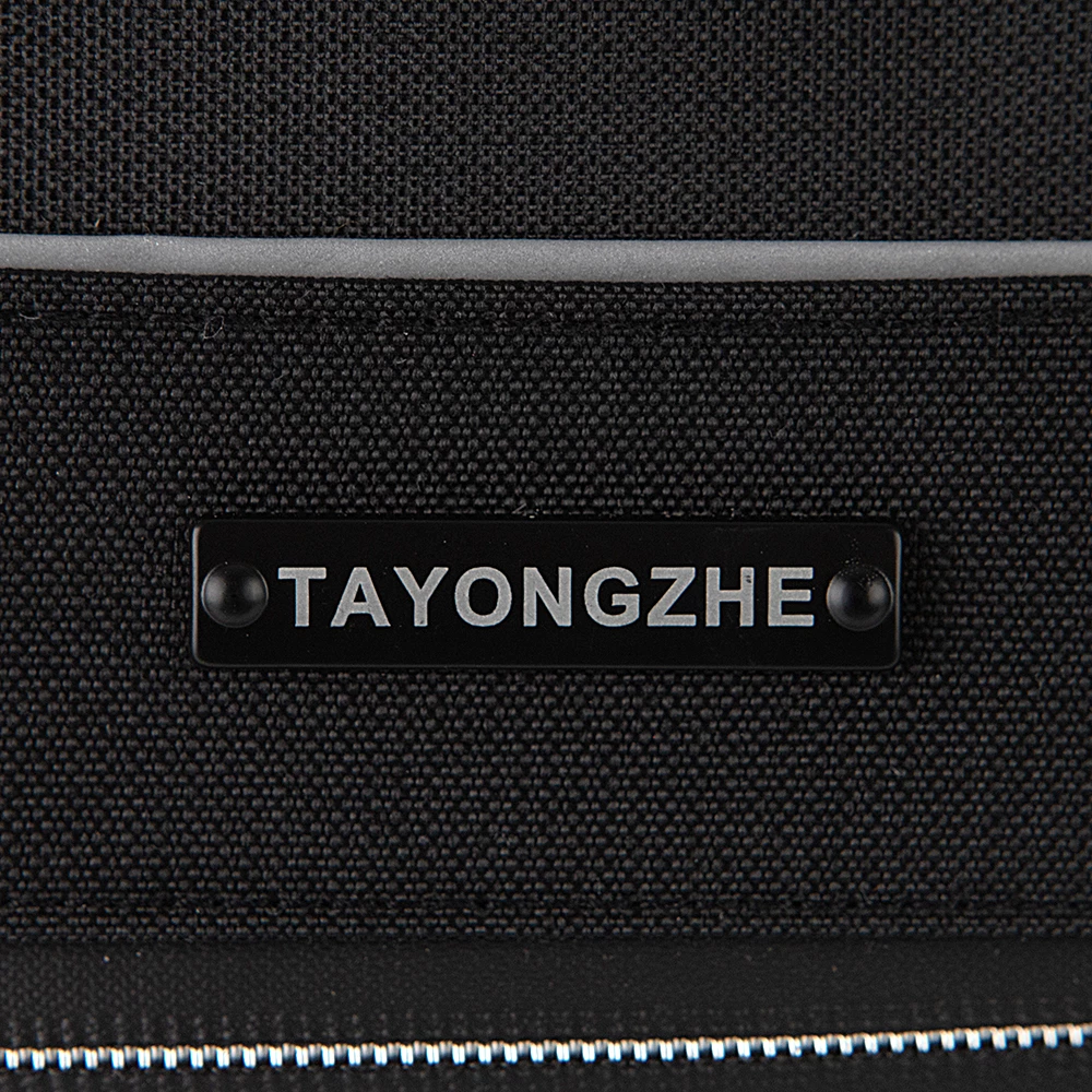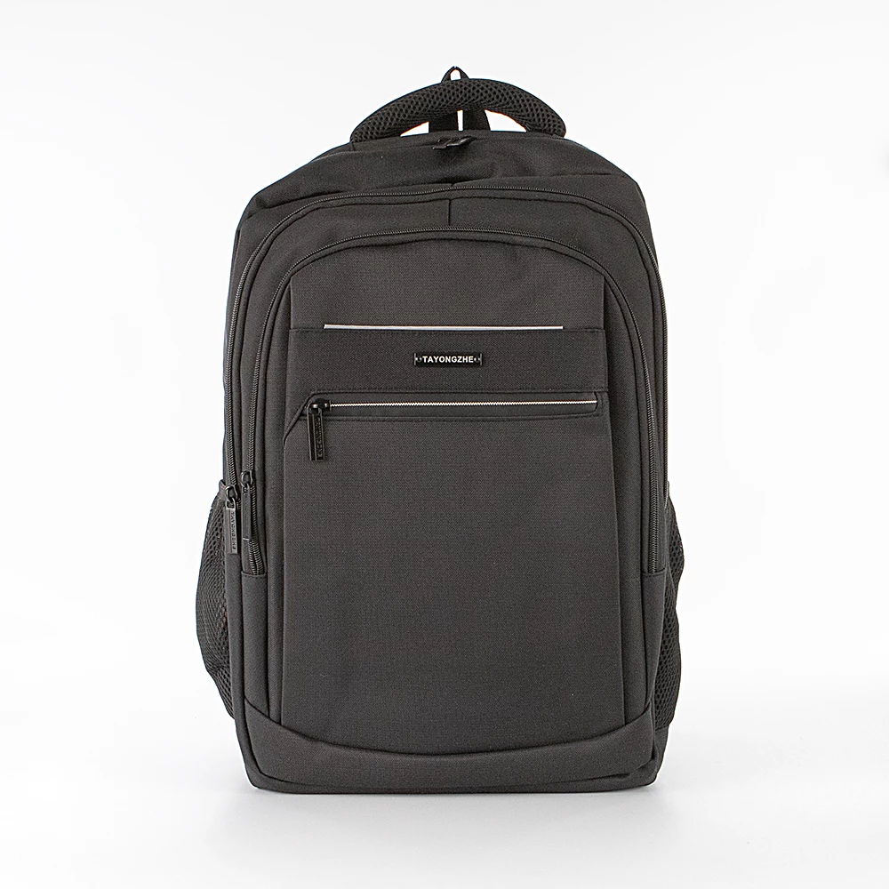 Рюкзак от бренда Tayongzhe из плотного практичного текстильного материала черного цвета. Модель с мягкой набивной ручкой, широкими регулируемыми плечевыми лямками с нагрудным фиксатором для равномерного распределения нагрузки. Спинка с анатомическими вставками и дышащим сетчатым верхним слоем. Два отделения на молнии, с текстильной подкладкой. В основном отделении – накладной карман с уплотненной стенкой. На лицевой стороне – два кармана на молнии, светоотражатель, повышающий безопасность в темное время. По бокам – карман-сетка.