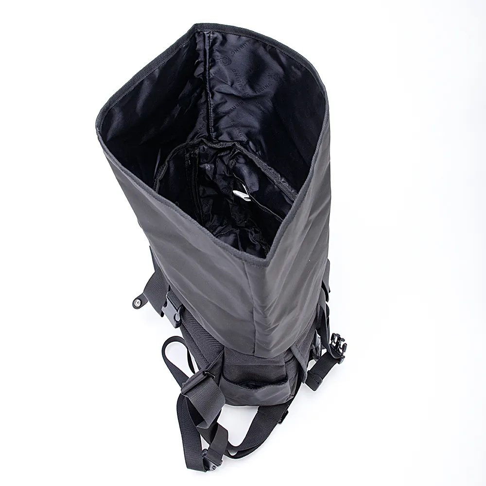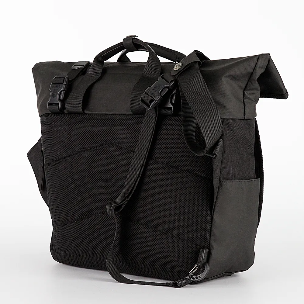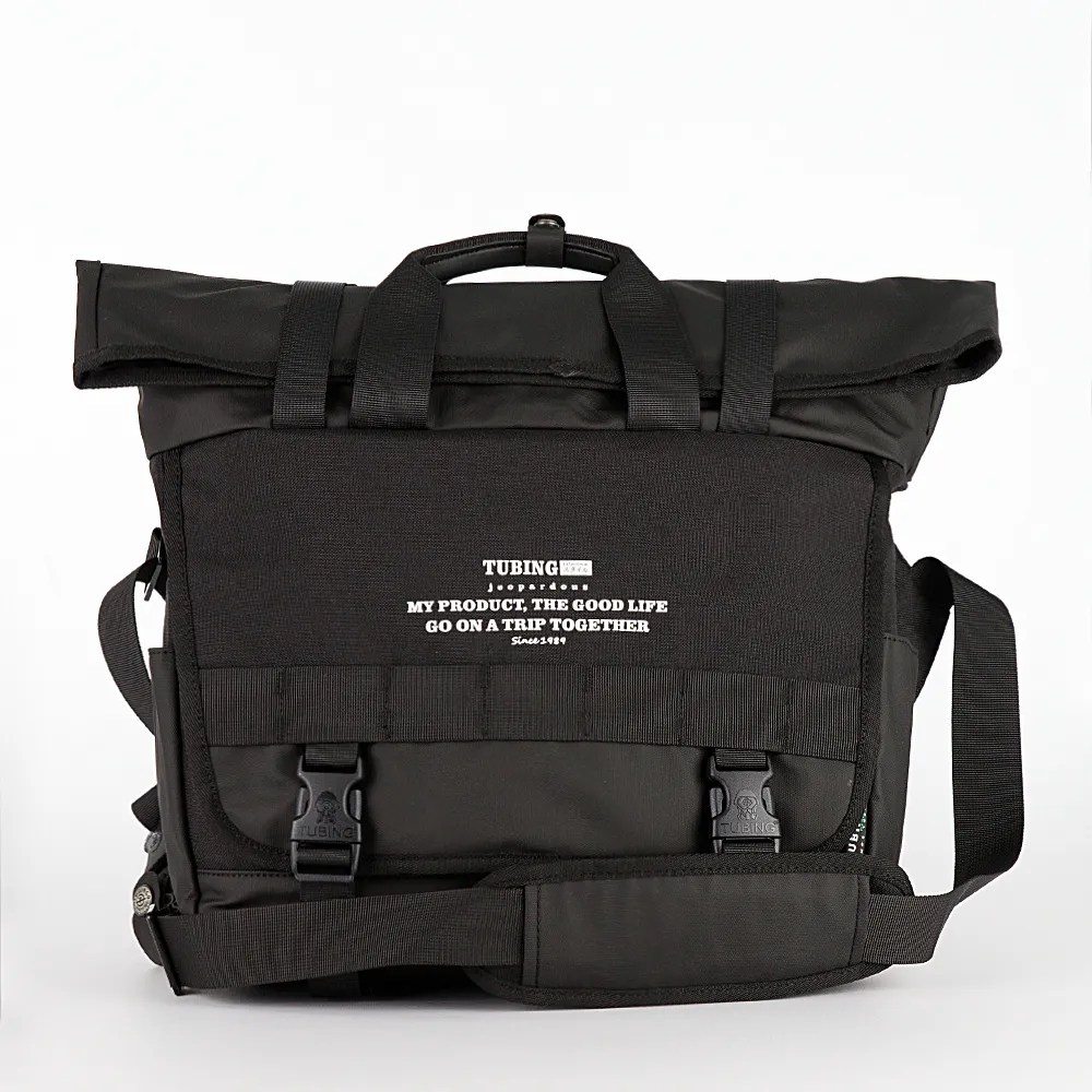 Оригинальная сумка от торговой марки Tubing из плотного текстильного материала черного цвета. Модель с двумя ручками с фиксатором на кнопке, съемным регулируемым плечевым ремнем с наплечником и съемным поясным ремнем-фиксатором. Удобная уплотненная спинка с верхним дышащим слоем и карманом на молнии для доступа в отделение со стороны спины. Отделение с возможностью увеличения за счет конструкции «фолдовер»; закрывается застежками фастекс. Внутри: текстильная подкладка, накладной карман с уплотненной стенкой для ноутбука, два накладных кармана. На лицевой стороне – три накладных кармана, закрывающиеся клапаном на застежках фастекс; на клапане – лямка для крепления. По бокам – карманы без застежки.