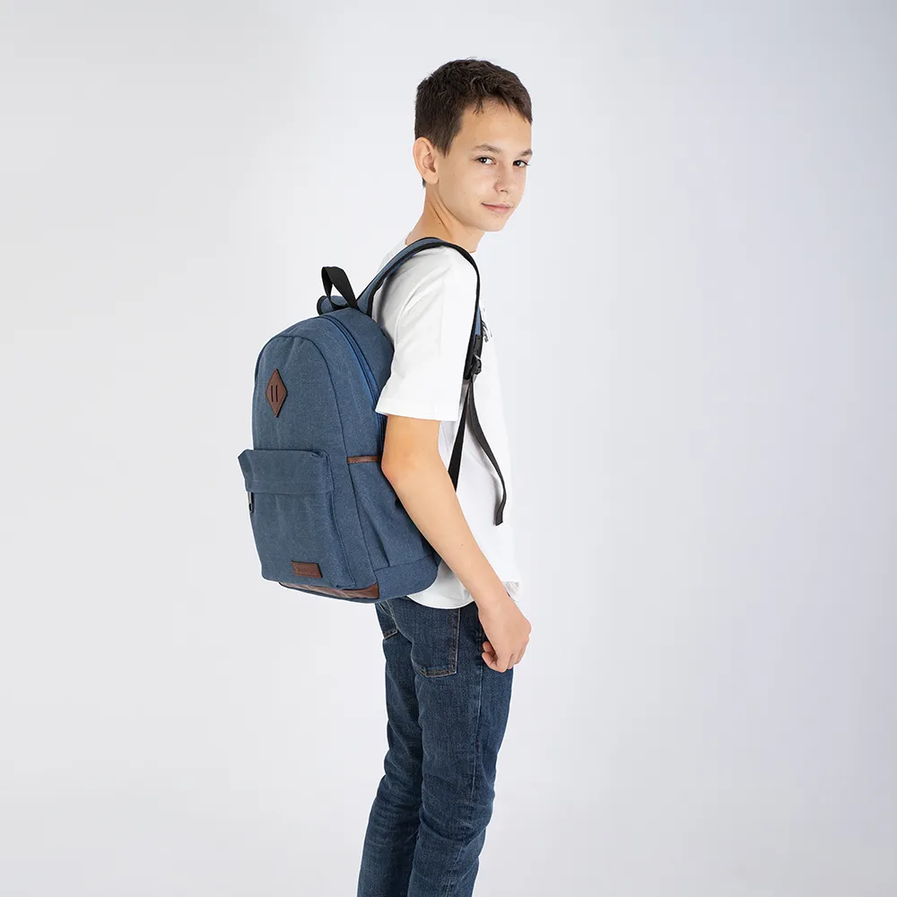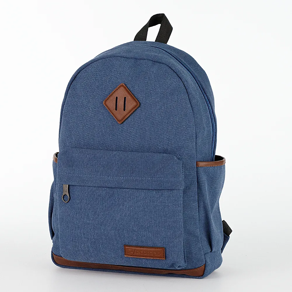 Рюкзак от торговой марки Ecotope из брезентовой ткани синего цвета. Модель с лямкой-переноской, регулируемыми плечевыми лямками. Отделение на молнии. Внутри: текстильная подкладка, накладной карман. На лицевой стороне – накладной карман на молнии. По бокам – накладной карман без застежки.