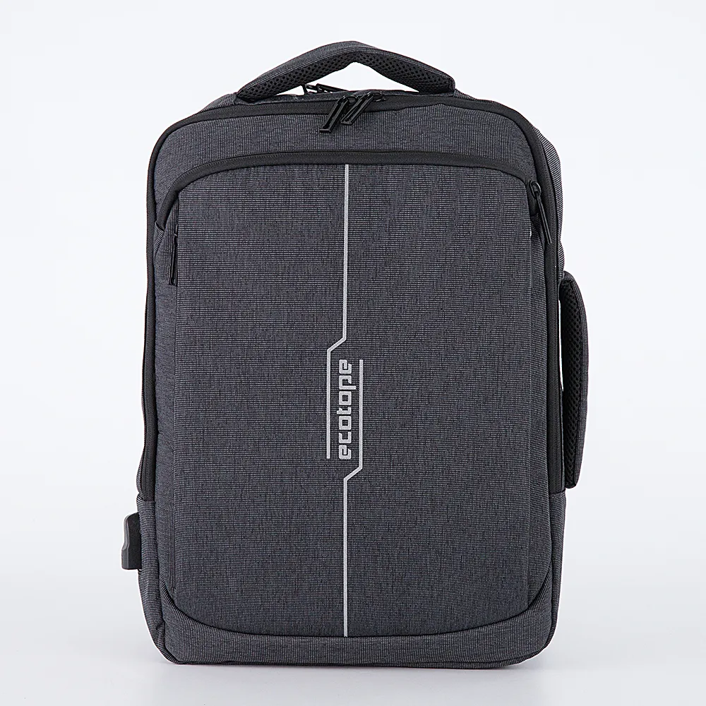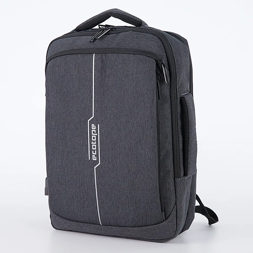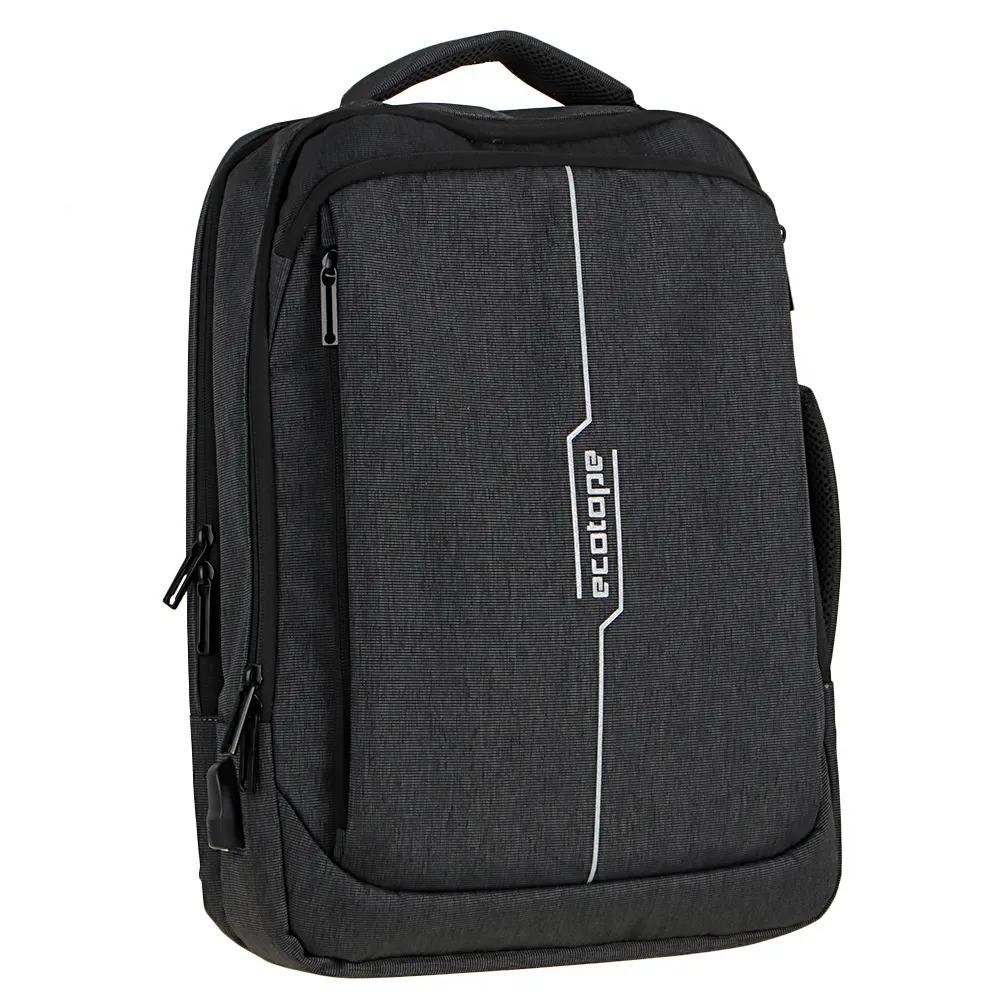 Сумка-рюкзак от торговой марки Ecotope выполнена из плотного текстильного материала в сочетании черного и серого цвета. Модель с плотными ручками сверху и сбоку и плечевыми лямками из дышащего материала, которые можно убрать в накладной карман на спинке. Два отделения на молнии по трем сторонам, что обеспечивает комфортный доступ. В одном из них – накладной карман на липучке для ноутбука; в другом – накладные карманы для канцелярских принадлежностей. Снаружи сбоку имеется USB-разъем. На передней стороне –два вместительных и один небольшой карман на молнии. На спинке имеется лямка для крепления на выдвижную ручку чемодана. Модель декорирован светоотражающей надписью с названием бренда.