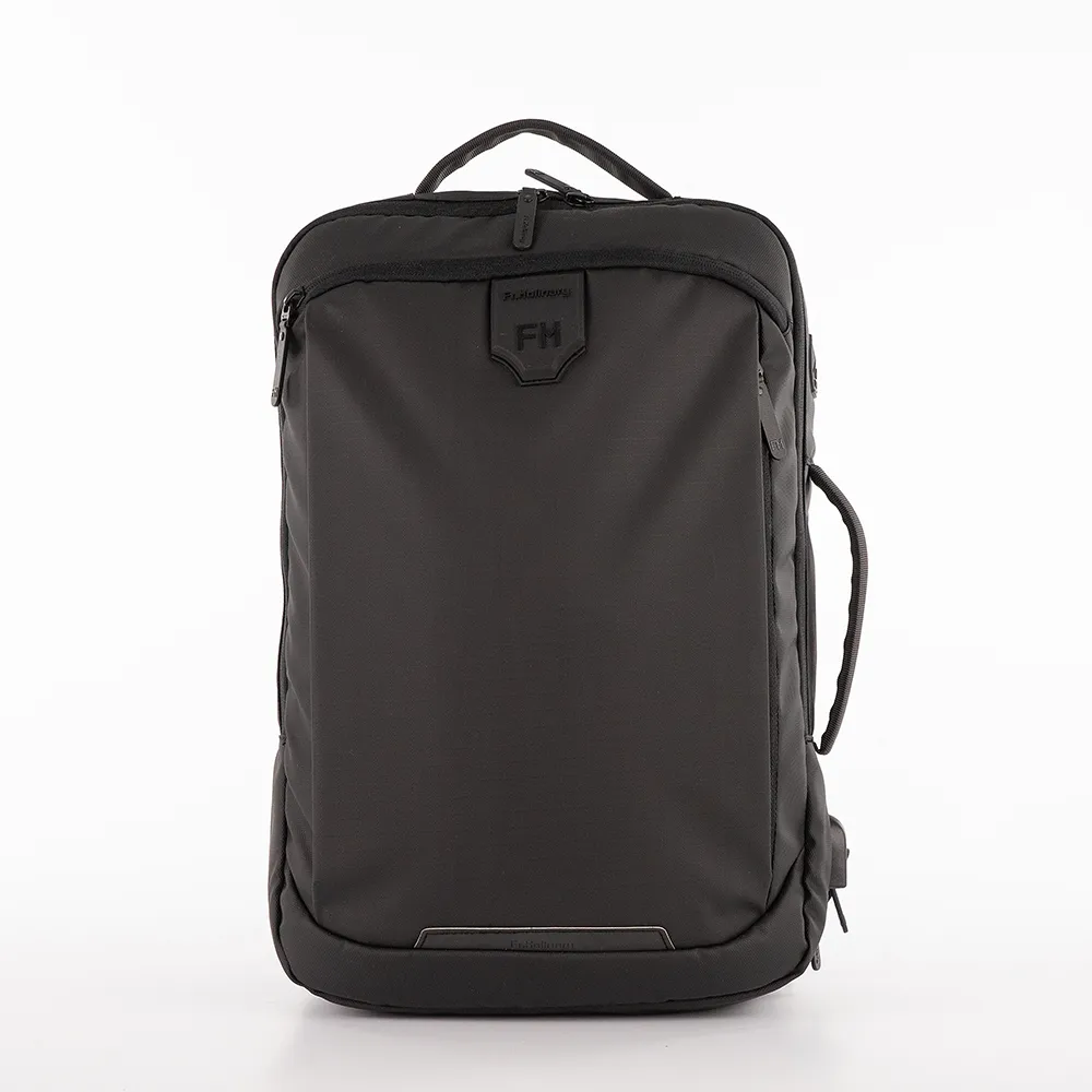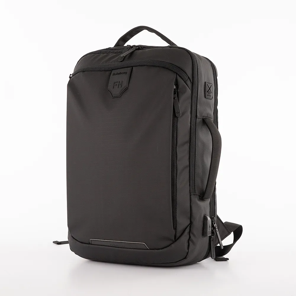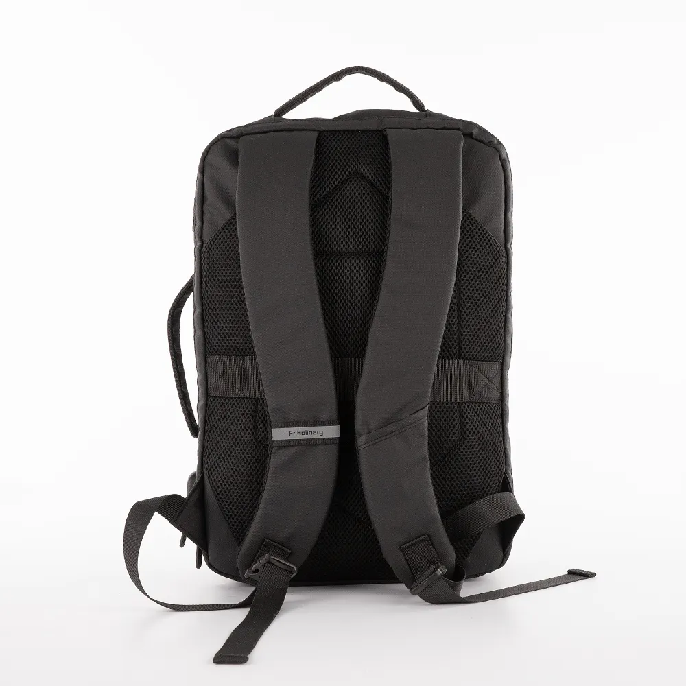 Функциональная сумка-рюкзак от торговой марки Francesco Molinary из прочного износостойкого полиэстера плотностью 900 Ден черного цвета. Модель с ручками сверху и сбоку (для ношения в качестве сумки), регулируемыми плечевыми лямками, которые убираются в карман на спинке; на плечевых лямках имеется кармашек и светоотражатели. Два отделения на молнии, с фирменной подкладкой. В основном отделении – два накладных кармана-сетки, органайзер для канцелярских принадлежностей. Заднее отделение на молнии по трем сторонам, что обеспечивает раскрытие на 180° и удобный доступ. Внутри: карман с уплотненной стенкой для ноутбука с фиксирующими эластичными ремнями, накладной карман. На лицевой стороне – непромокаемый карман на молнии. На спинке с верхним дышащим слоем имеется лямка для крепления на выдвижную ручку чемодана сбоку – выход для наушников.