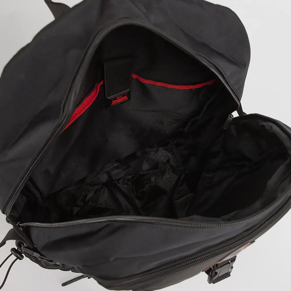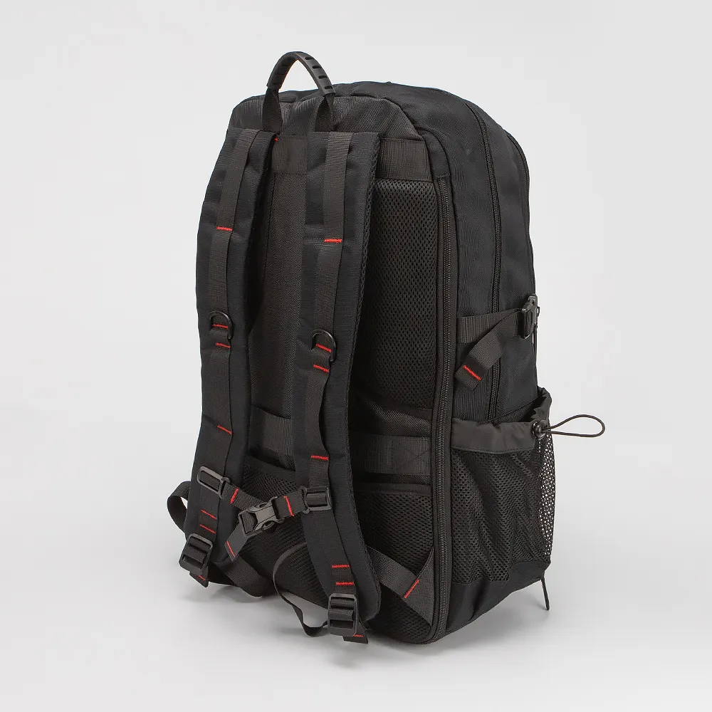 Функциональный рюкзак от торговой марки Francesco Molinary из прочного износостойкого текстильного материала черного цвета. Модель большого размера с лямкой-переноской с прорезиненной накладкой, плотными широкими регулируемыми плечевыми лямками с ремнями для крепления и нагрудным фиксатором для распределения нагрузки. Спинка с дышащими вставками; имеется лямка для крепления на выдвижную ручку чемодана. Глубокое отделение на молнии. Внутри: фирменная подкладка, накладной карман с уплотненной стенкой для ноутбука, USB-кабель для внешнего портативного аккумулятора Power Bank, при подключении которого можно подзаряжать гаджеты через USB-порт, расположенный снаружи сбоку. По бокам – стягивающие ремни, карман-сетка на резинке. На лицевой стороне – два накладных кармана, вместительное отделение с органайзером для канцелярских принадлежностей; снизу карман на молнии, представляющий собой непромокаемое вентилируемое отделение для обуви (снаружи на нем имеется лямка для крепления). На задней стороне – раздвижка на молнии для увеличения объема. Рюкзак идеален для поездок и путешествий.