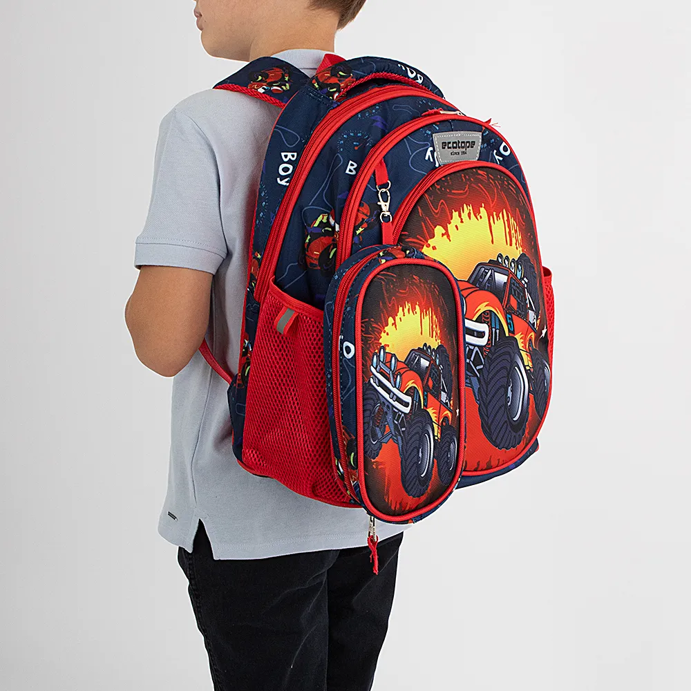 Рюкзак от торговой марки Ecotope из текстильного материала. Декорирован оригинальным принтом с изображением внедорожника. Модель с лямкой-переноской, ручкой и регулируемыми плечевыми лямками. Два отделения на молнии, с текстильной подкладкой. В основном отделении – накладной карман. На лицевой стороне – карман на молнии. По бокам – карман-сетка на резинке. Уплотненная спинка с дышащей накладкой. В комплекте имеется пенал, который крепится карабином к кольцу на лицевой стороне рюкзака; пенал с отделением на молнии и текстильной подкладкой.