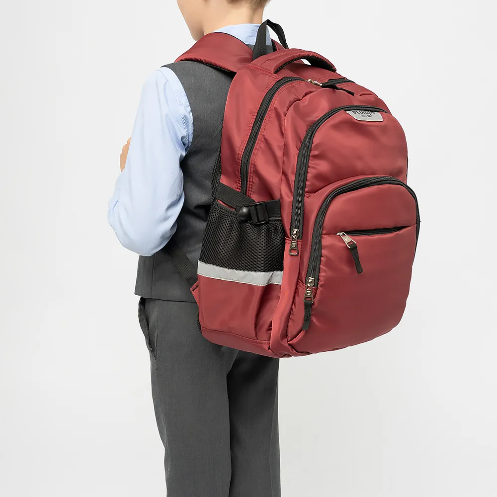 Рюкзак от торговой марки Ecotope из текстильного материала бордового цвета. Модель с лямкой-переноской, ручкой и регулируемыми плечевыми лямками. Два отделения на молнии, с текстильной подкладкой. В основном отделении – накладной карман. На лицевой стороне – два кармана на молнии. По бокам – карман-сетка на резинке, стягивающие ремни на застежке фастекс. Спинка с дышащим сетчатым верхним слоем. На плечевых лямках и боковых карманах – светоотражатели, повышающие безопасность в темное время.