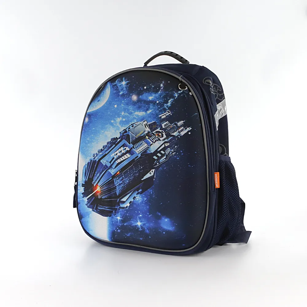 Ранец от торговой марки Ecotope из плотного текстильного материала. Декорирован рисунком с изображением космического корабля и космонавтами по бокам со светоотражающим эффектом. Модель с лямкой-переноской с пластиковой накладкой, мягкой набивной ручкой, регулируемыми плечевыми лямками с более износостойкой конструкцией в форме майки со светоотражателями, повышающими безопасность в темное время. Ортопедическая спинка с анатомическими вставками с верхним дышащим слоем. Два отделения на молнии, с текстильной подкладкой. В основном отделении – накладной карман и фиксирующая резинка. По бокам – карман-сетка. На лицевой стороне – кольцо для крепления брелока.